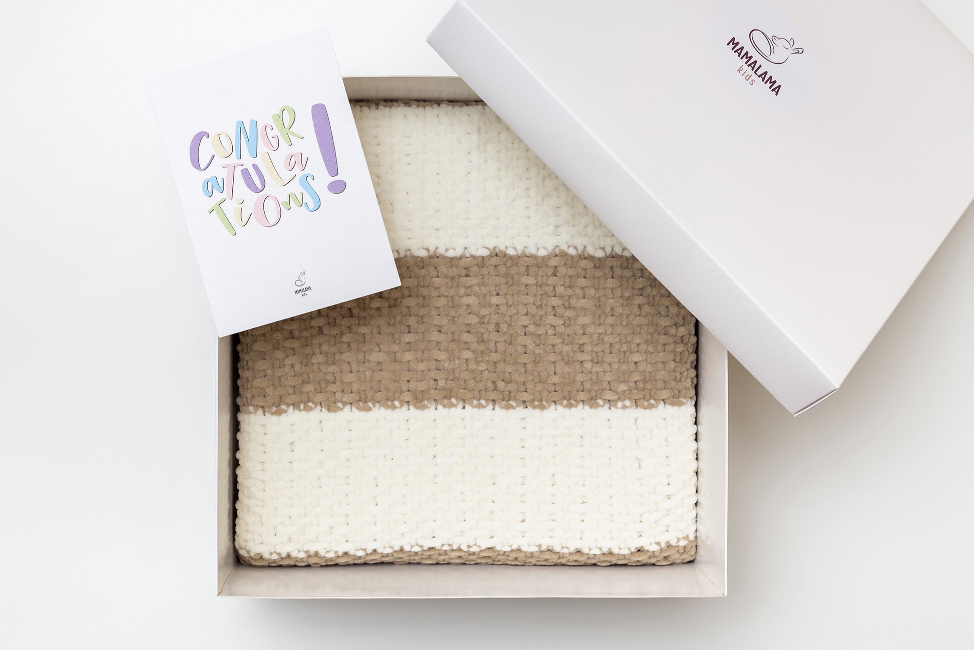 This is a gift box set which consists of a blanket, toy, tissue paper, and a cute white box. The blanket is 100x80 cm or 39.3x31.4 inches.