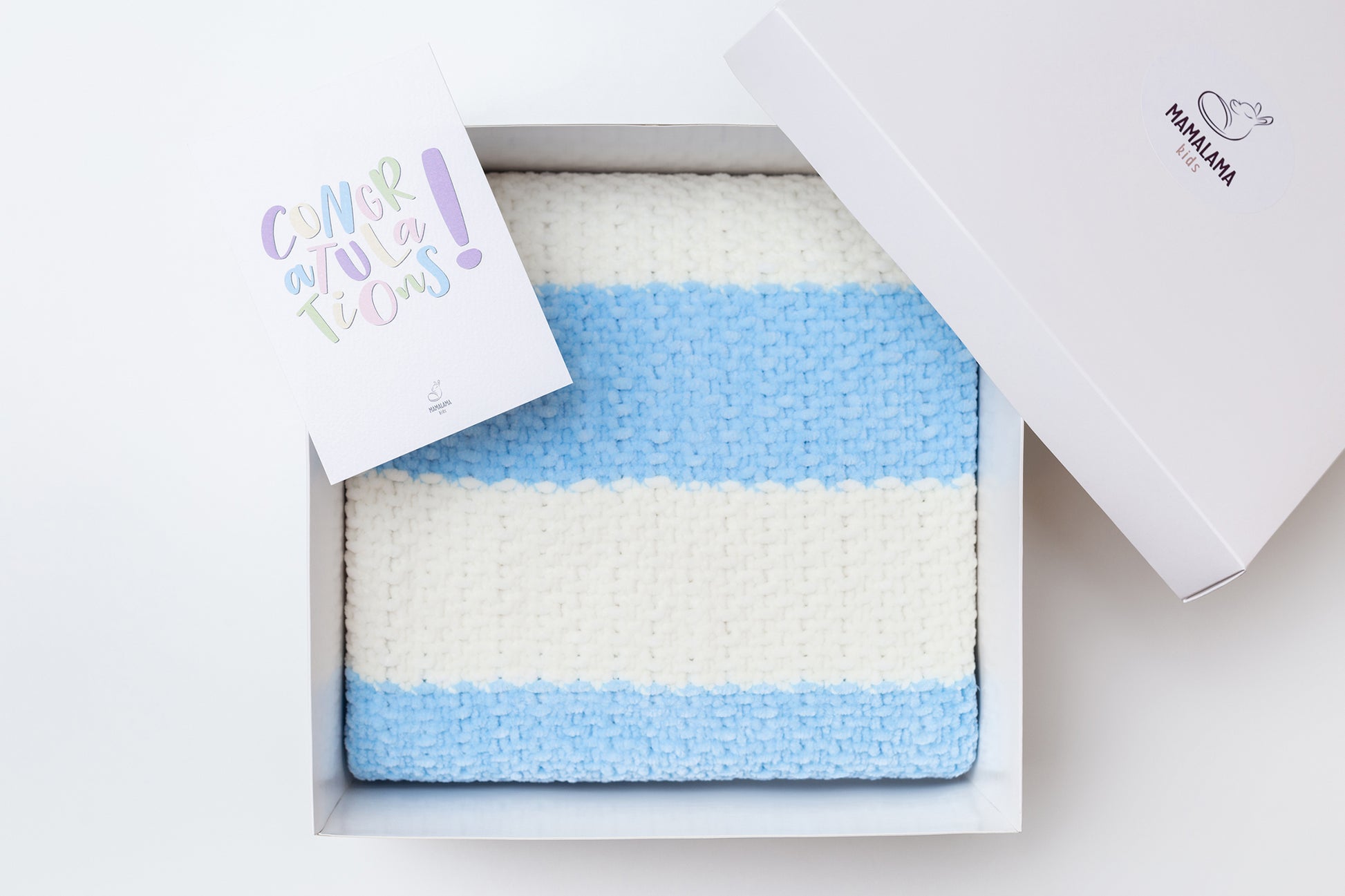 This is a gift box set which consists of a blanket, toy, tissue paper, and a cute white box. The blanket is 100x80 cm or 39.3x31.4 inches.
