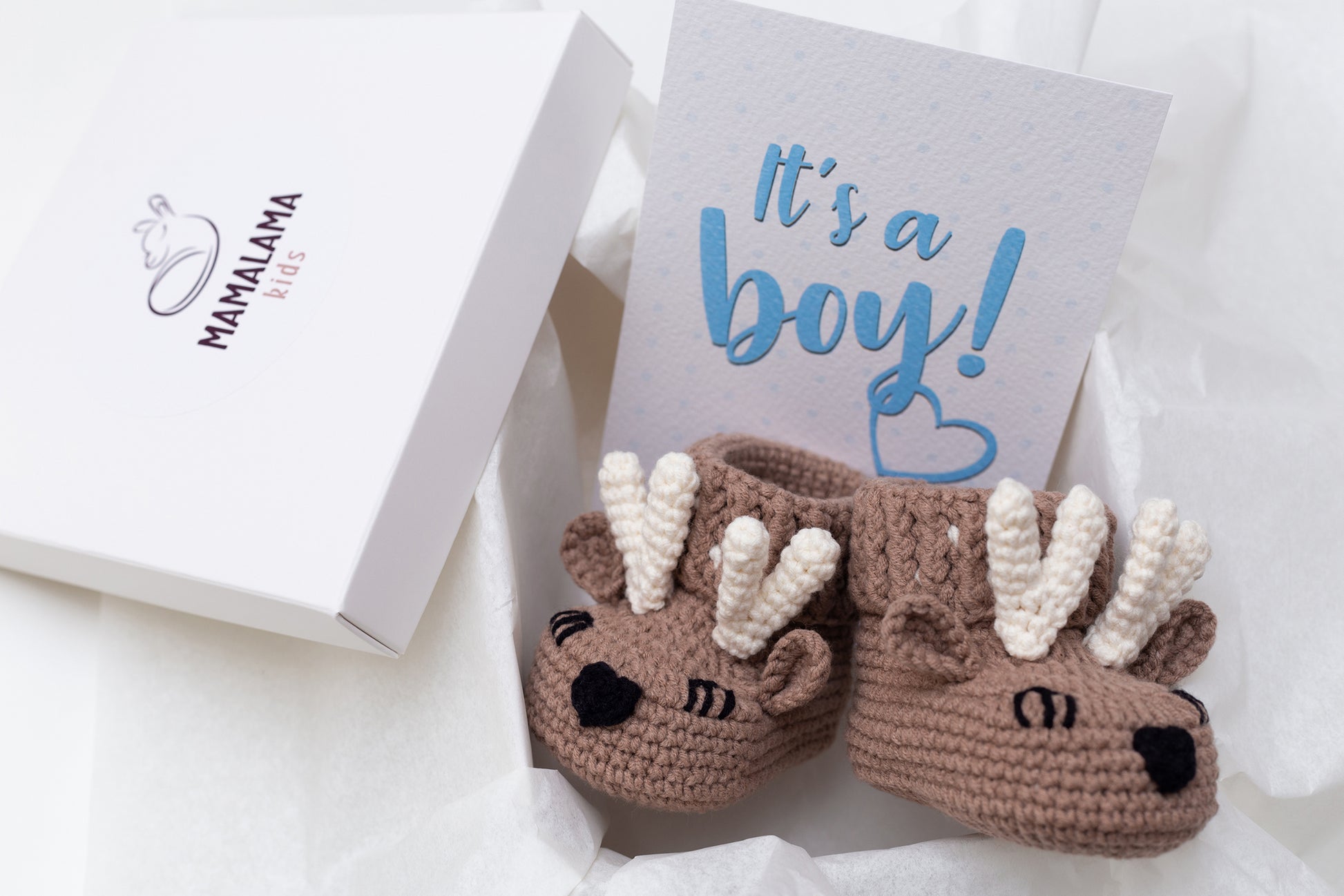 Unique pregnancy gift box for mom to be with cute animal booties. Woodland deer newborn soft sole shoes congratulations basket.