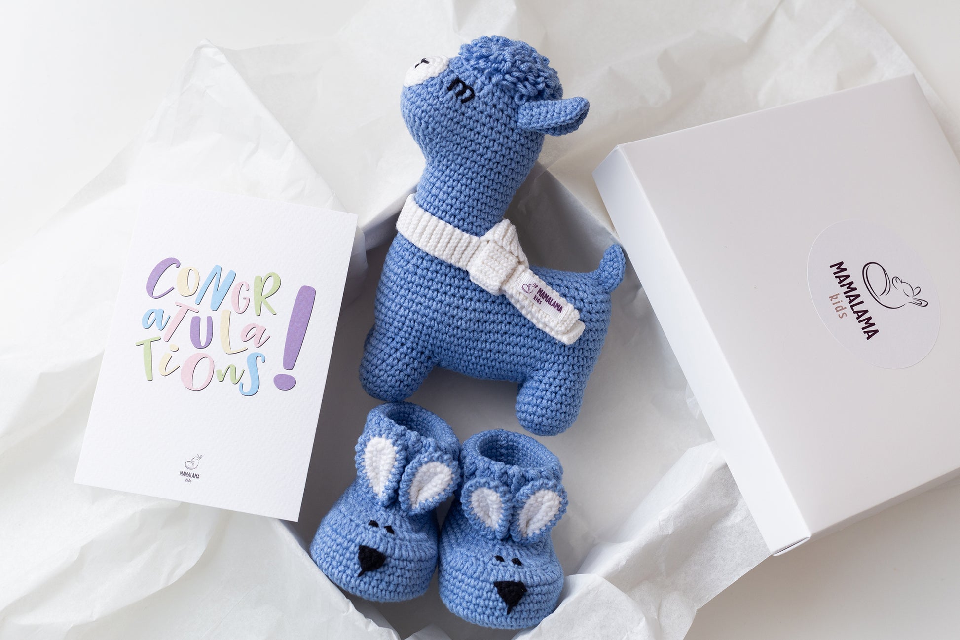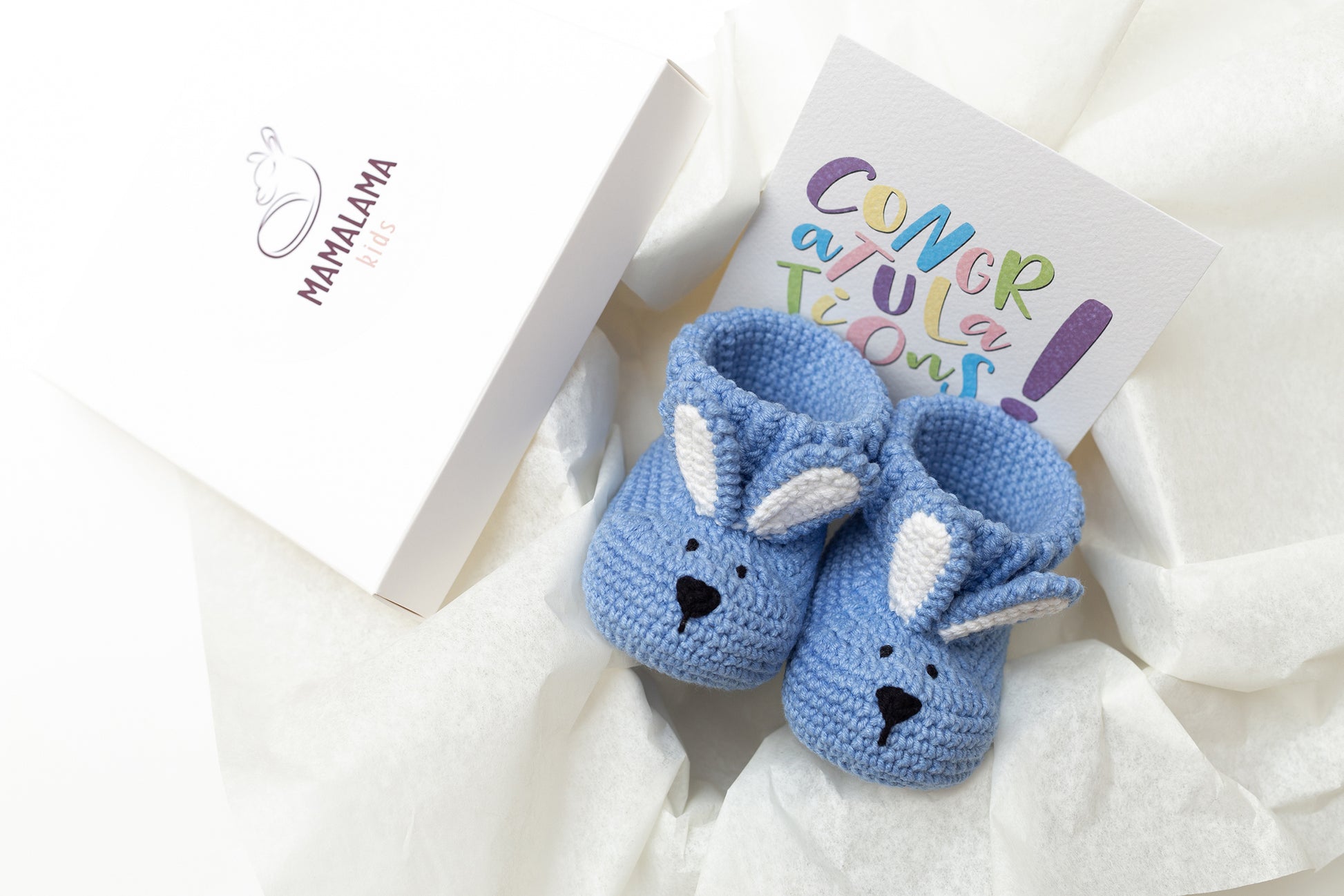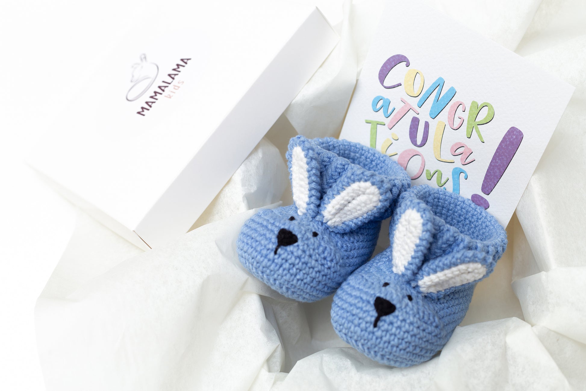 Unique pregnancy gift box for mom to be with cute animal booties. Farm bunny newborn soft sole shoes congratulations basket.