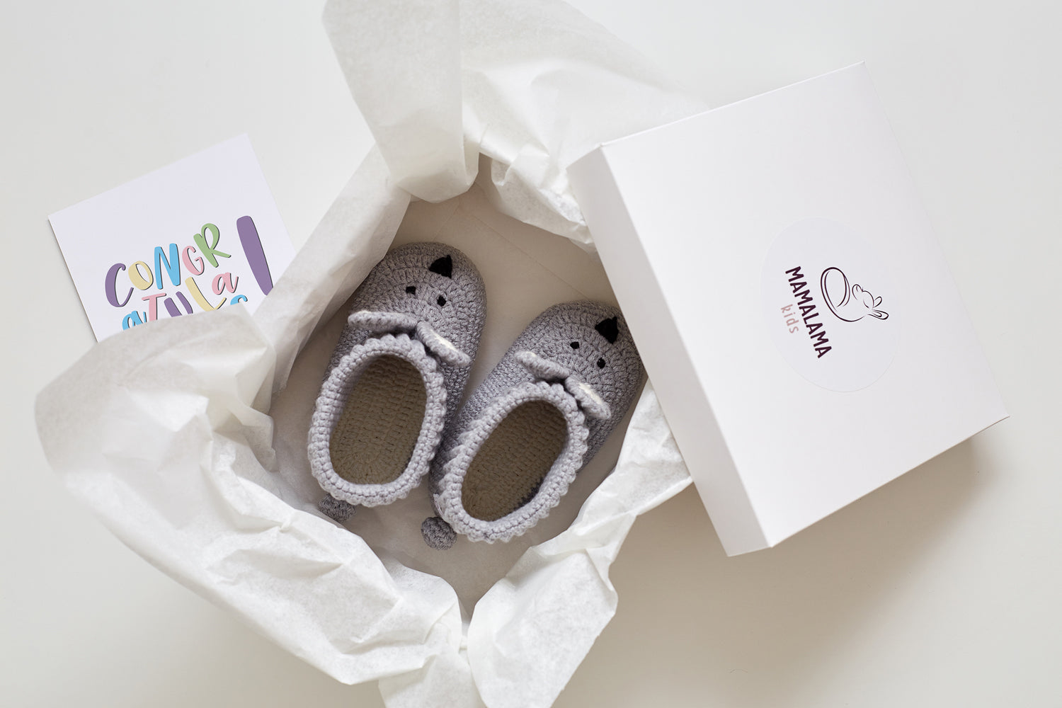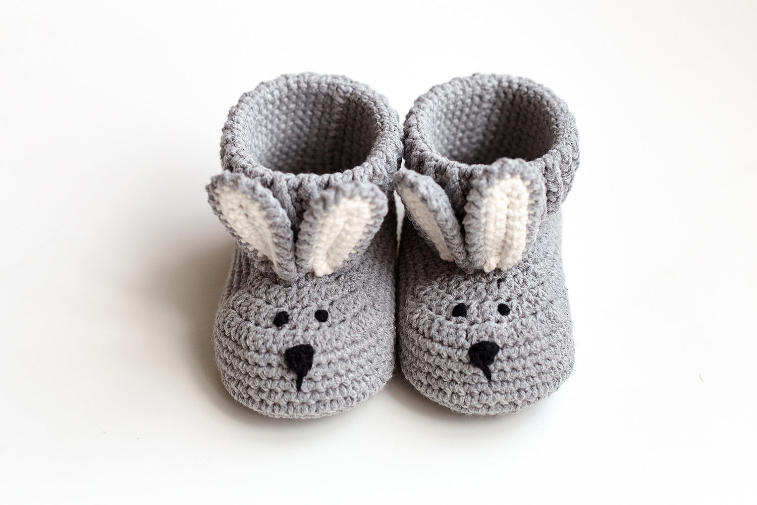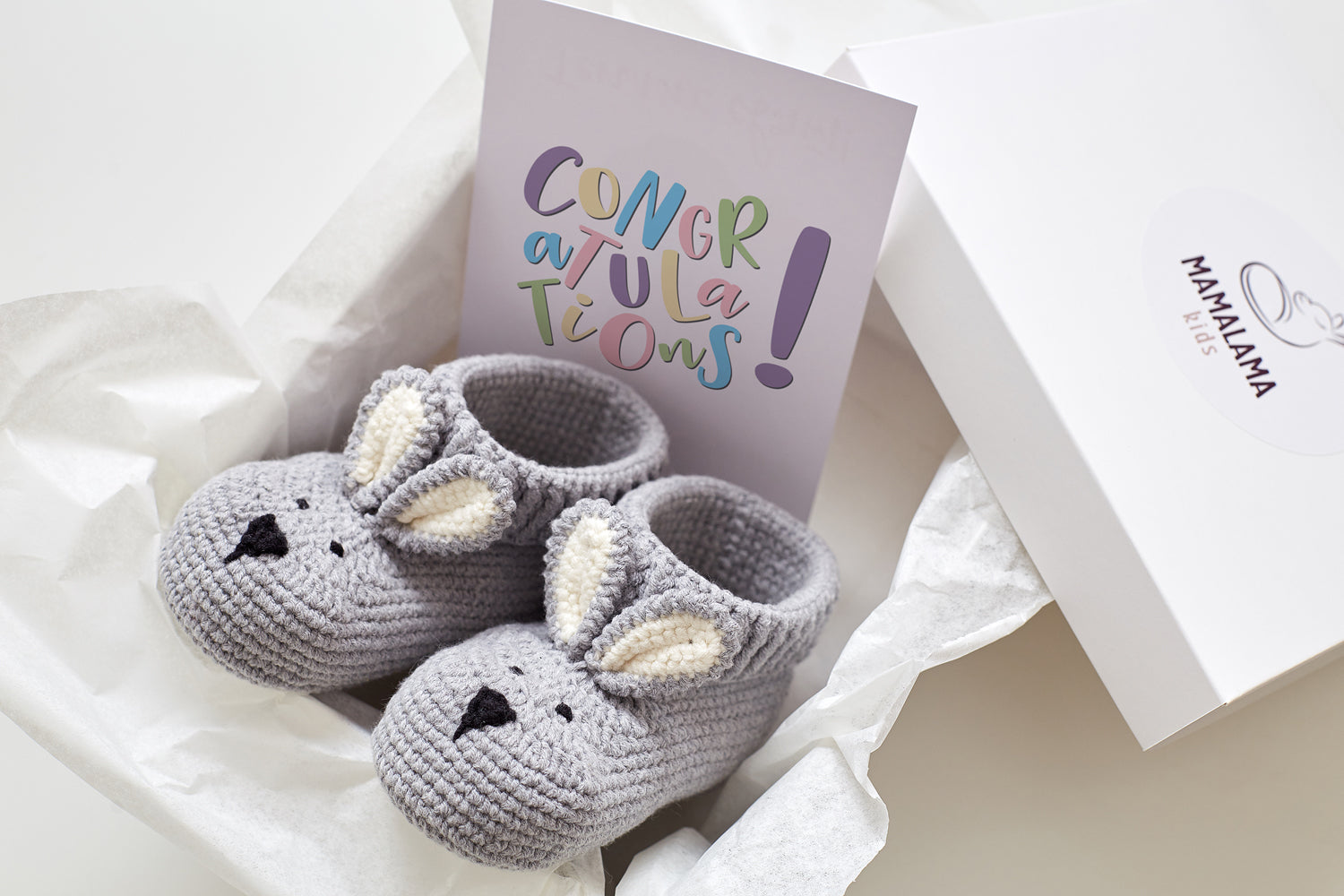 Unique pregnancy gift box for mom to be with cute animal booties. Farm bunny newborn soft sole shoes congratulations basket.
