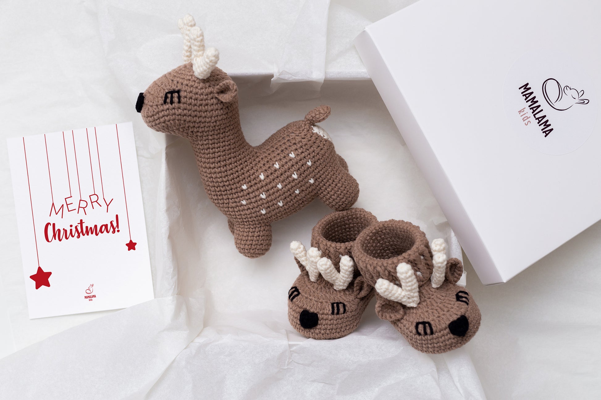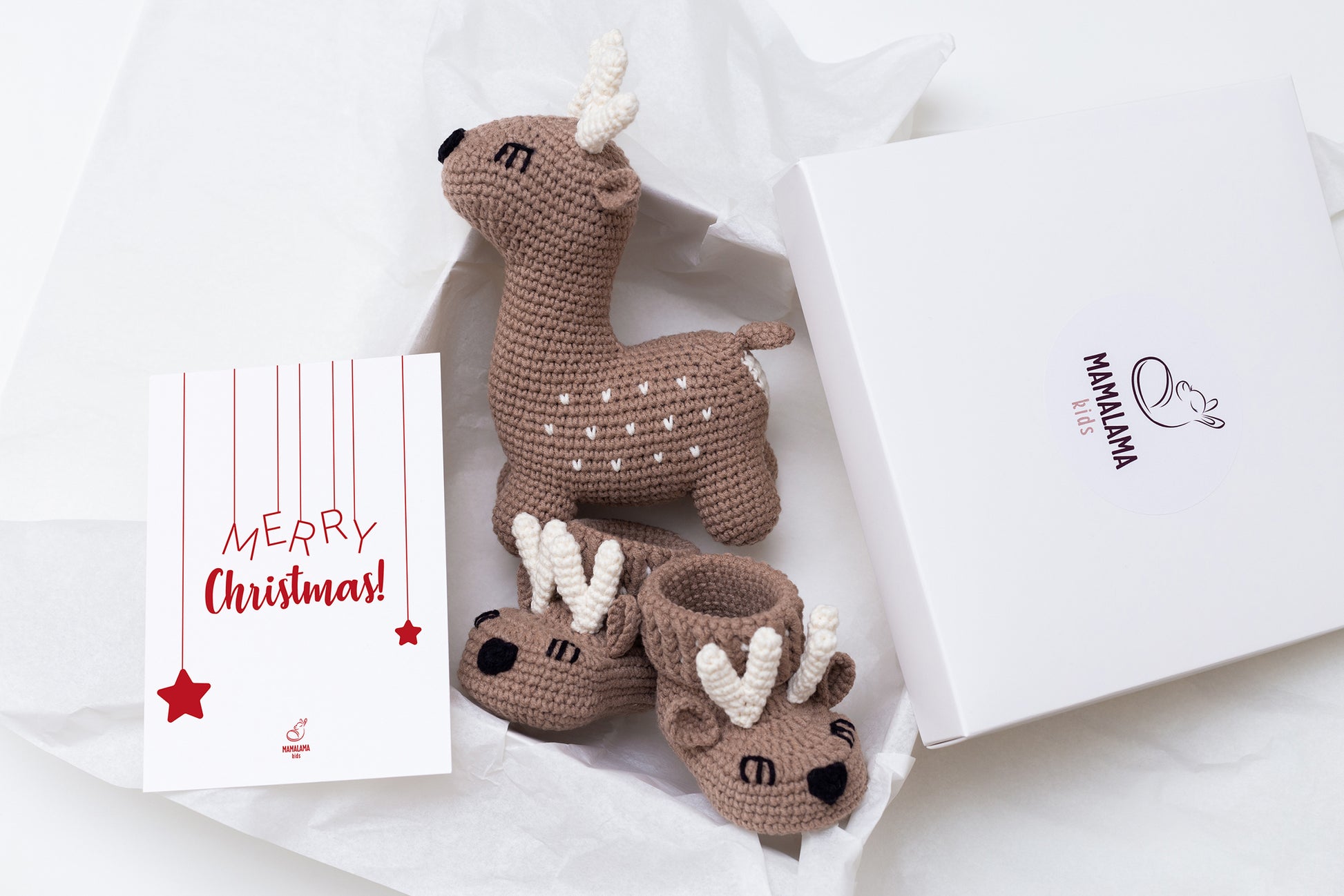 This is a gift box set which consists of deer toy, booties, tissue paper, and a cute white box.