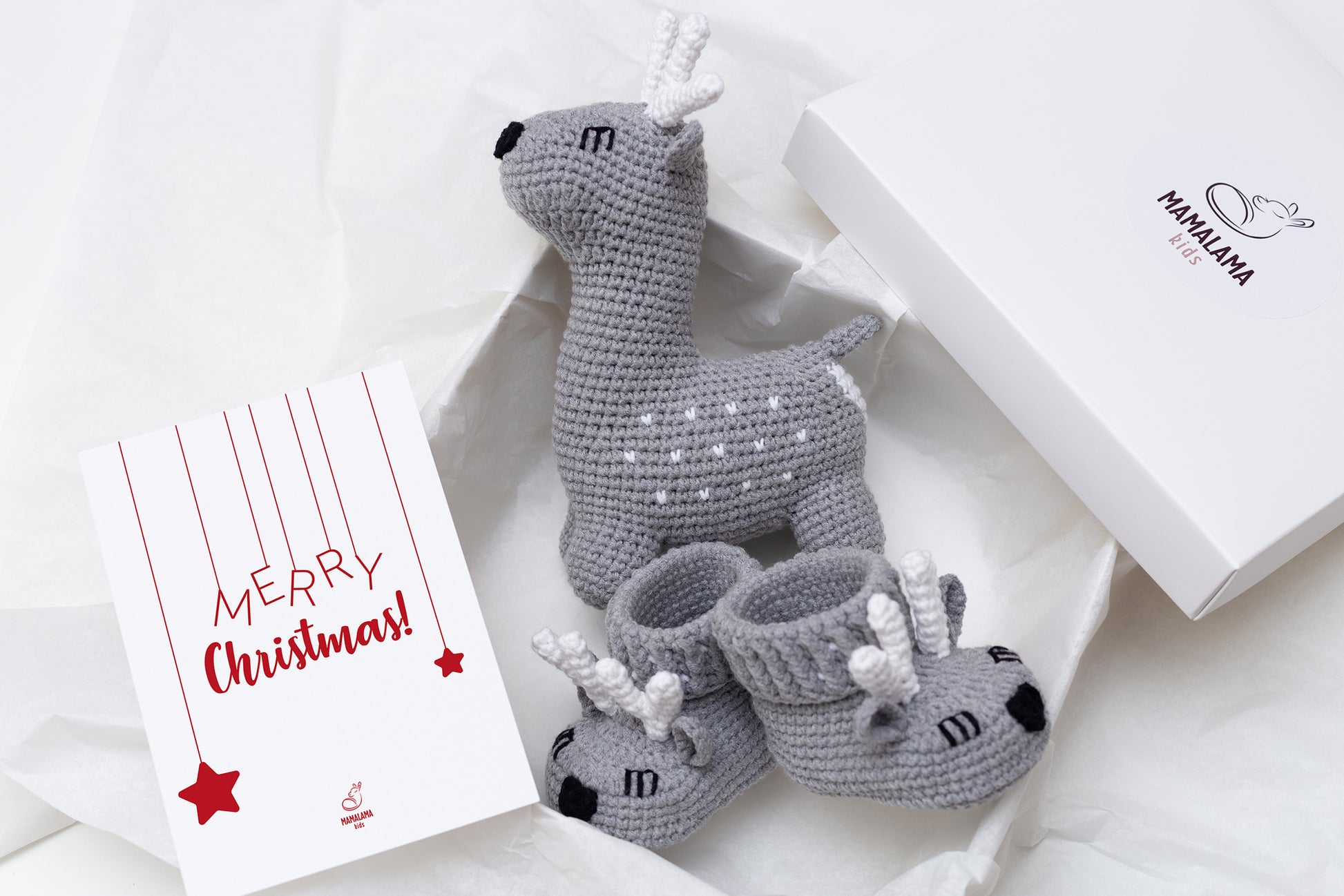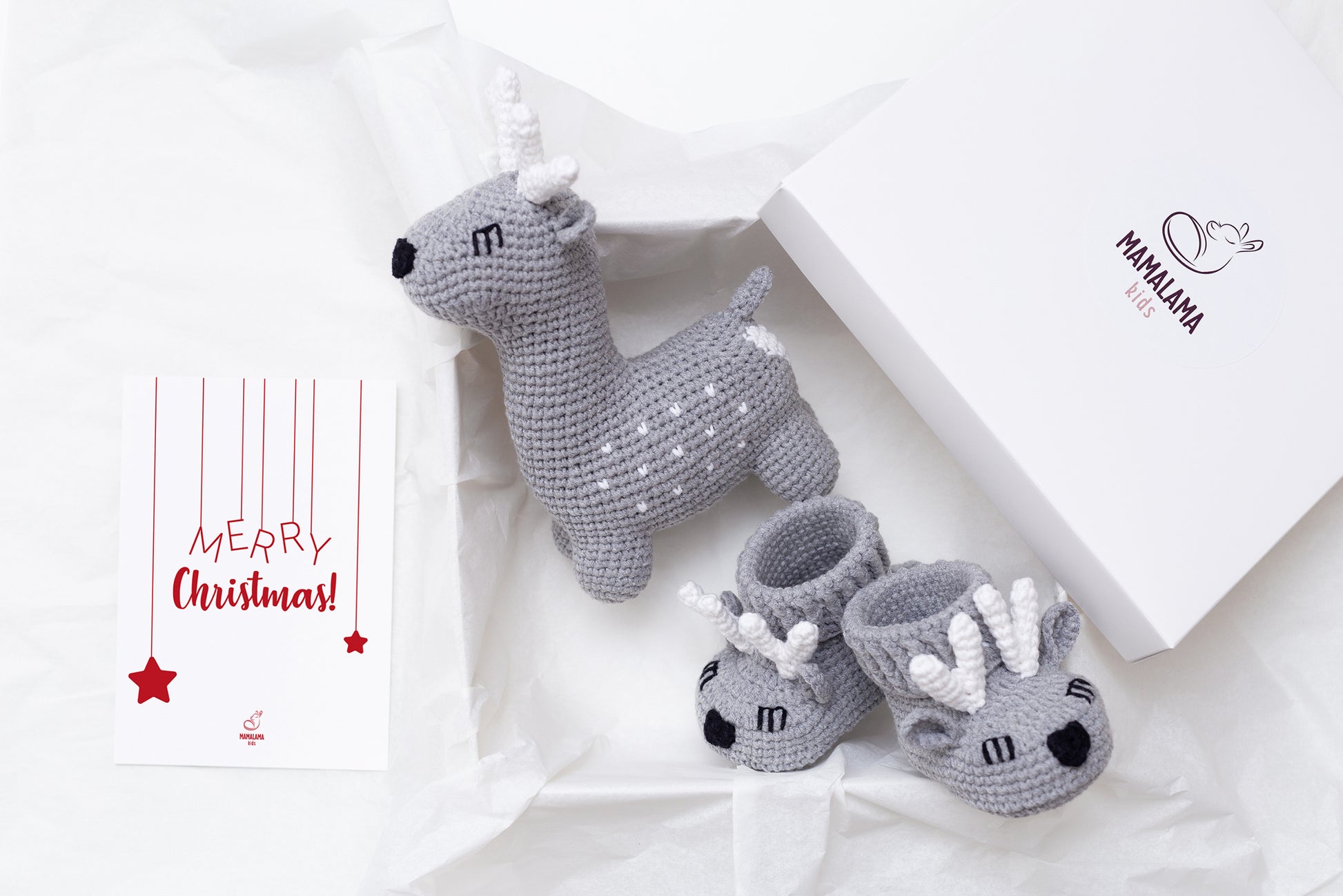 This is a gift box set which consists of deer toy, booties, tissue paper, and a cute white box.