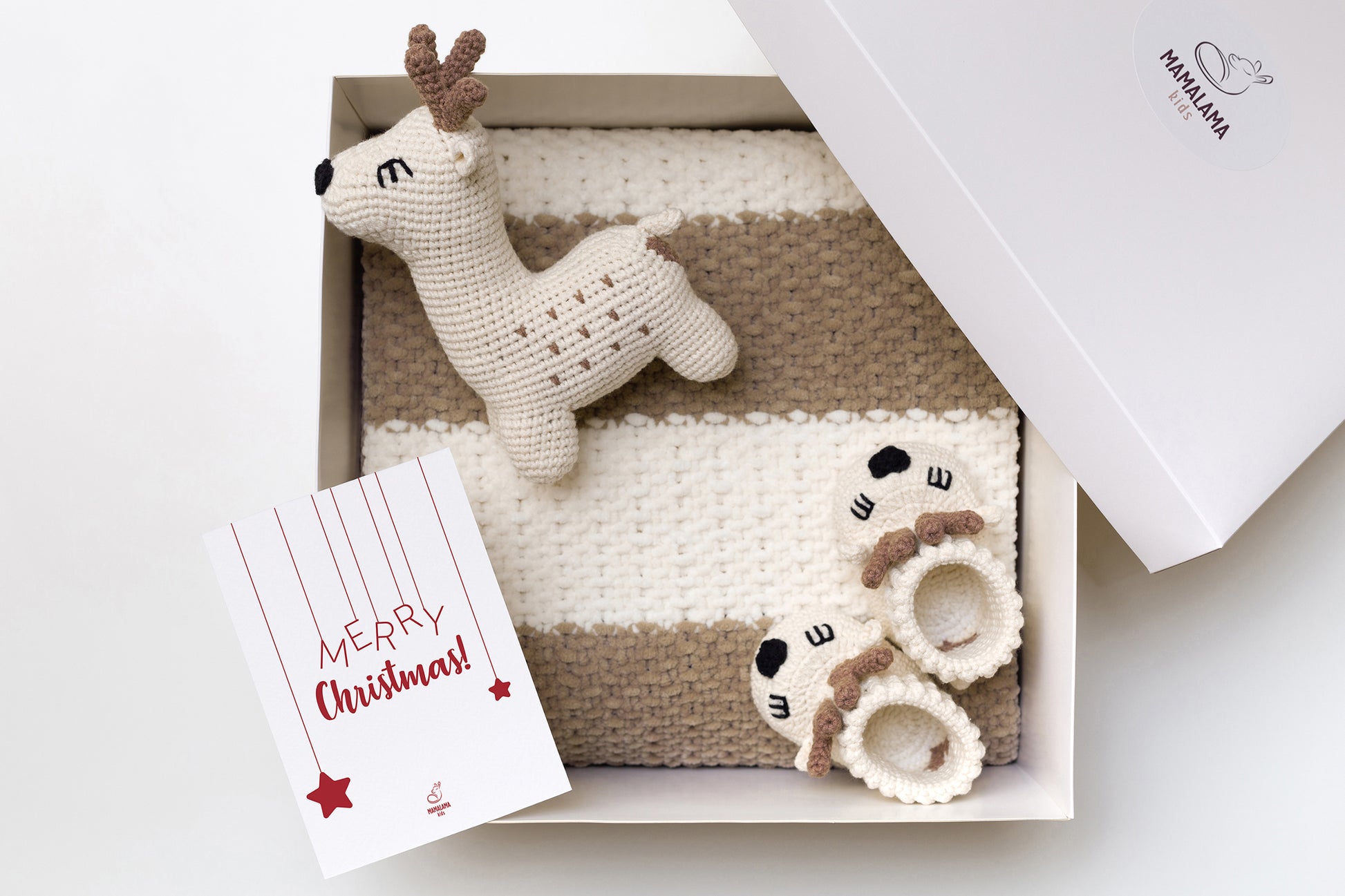 This gift box set includes a blanket and booties wrapped in paper and packaged in a cute white box.