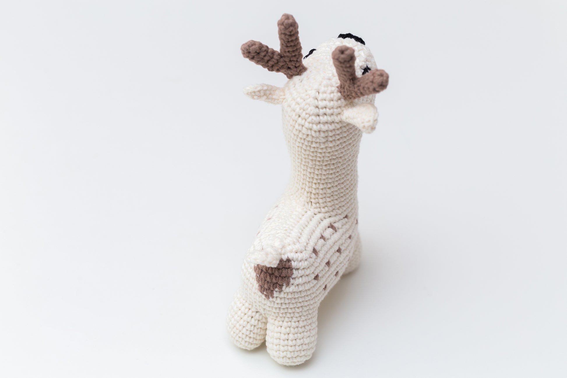 The reindeer toy is 6 2/8" tall (16 cm). It's just the right size for a baby to play with and can also serve as a cute decor item.