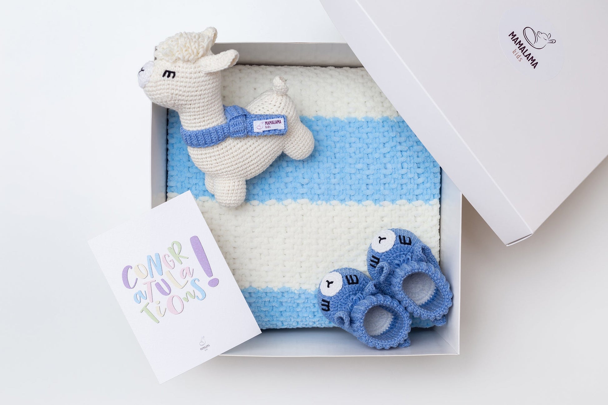 If you have any questions I am always in touch and reply asap! This is a gift box set which consists of a blanket, toy, booties, tissue paper, and a cute white box.