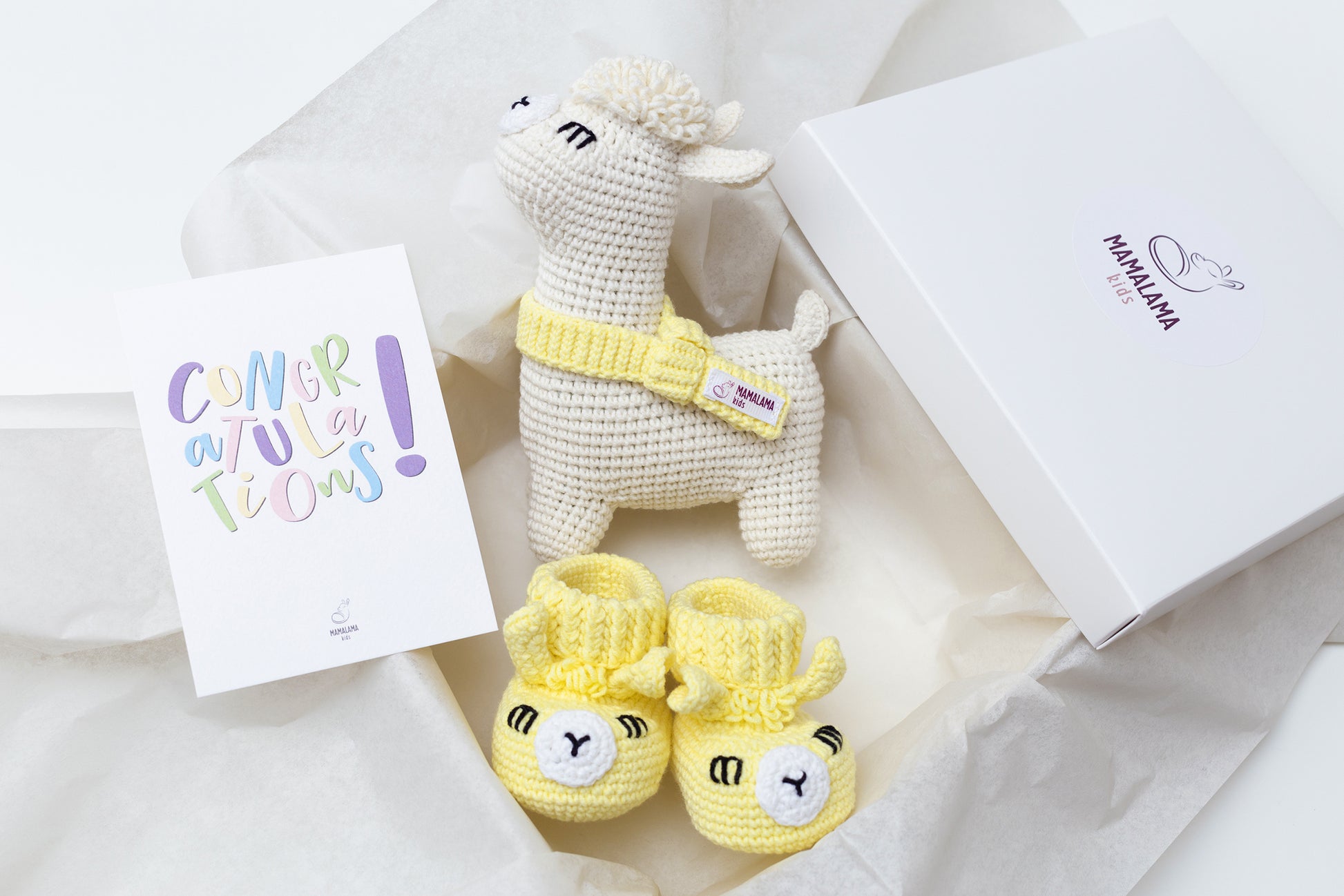 This is a gift box set which consists of a toy, booties, tissue paper, and a cute white box.