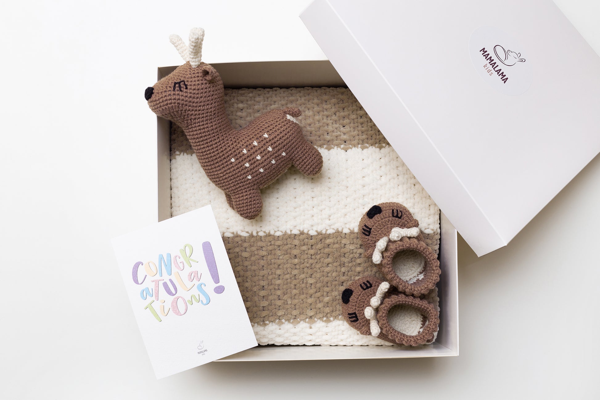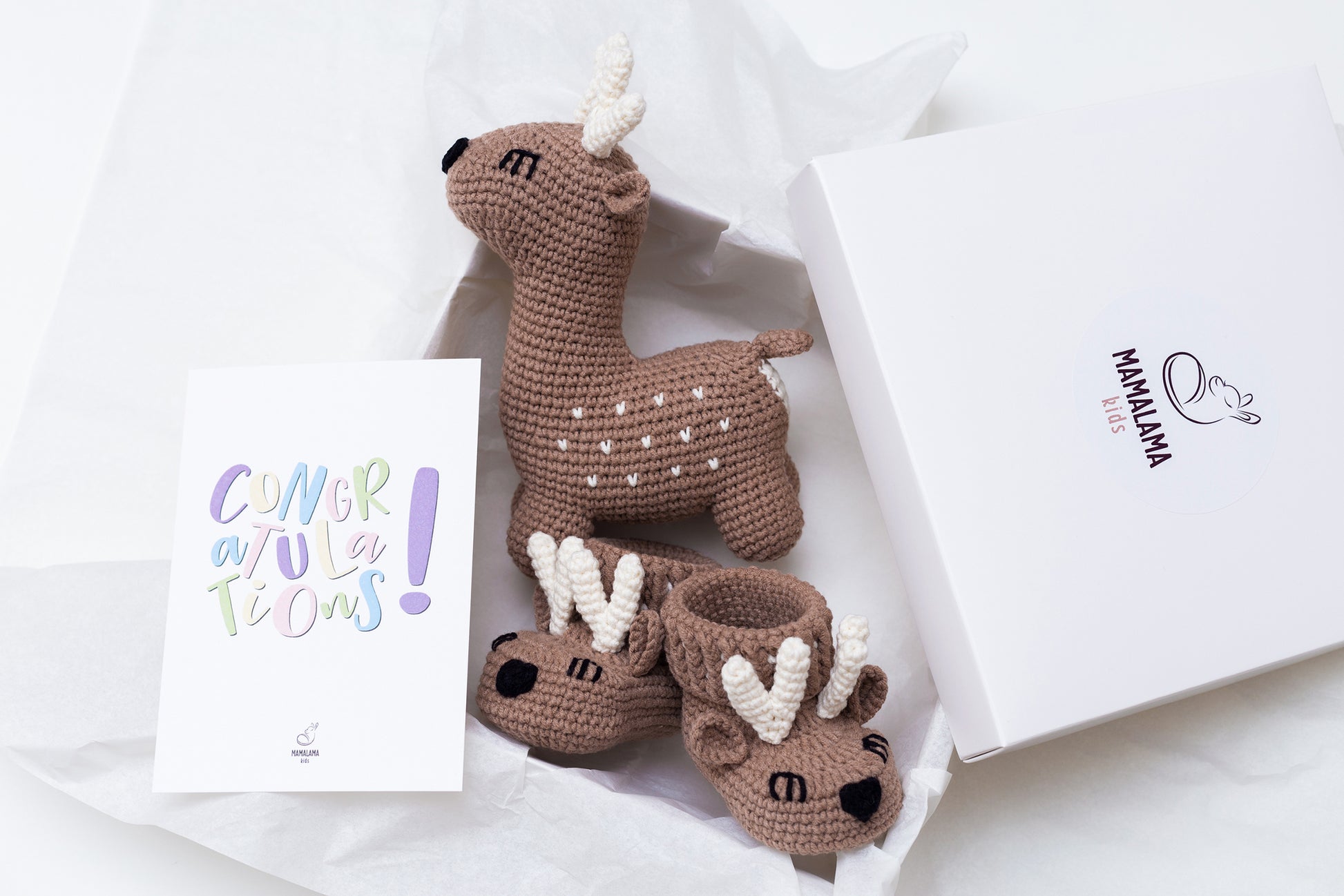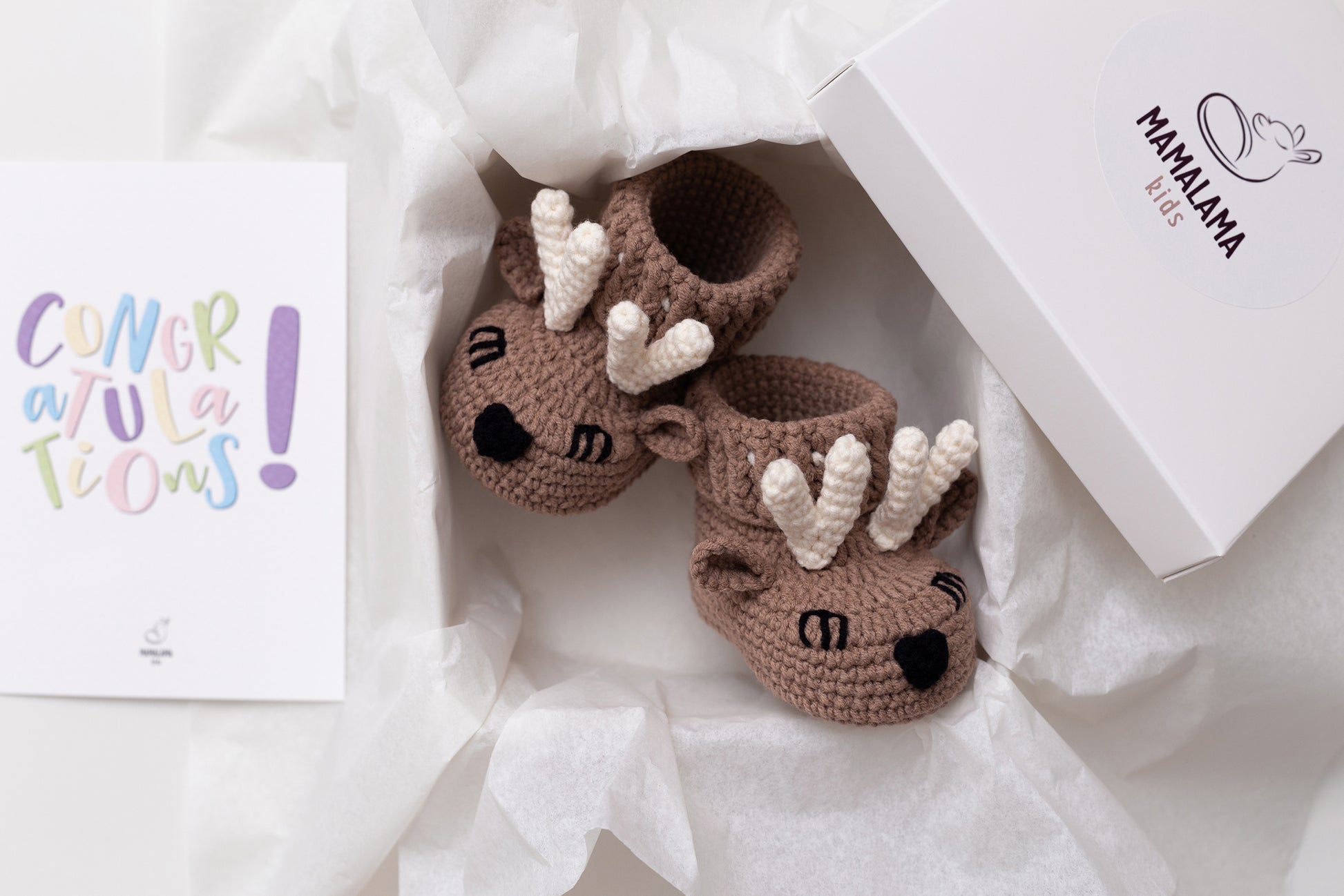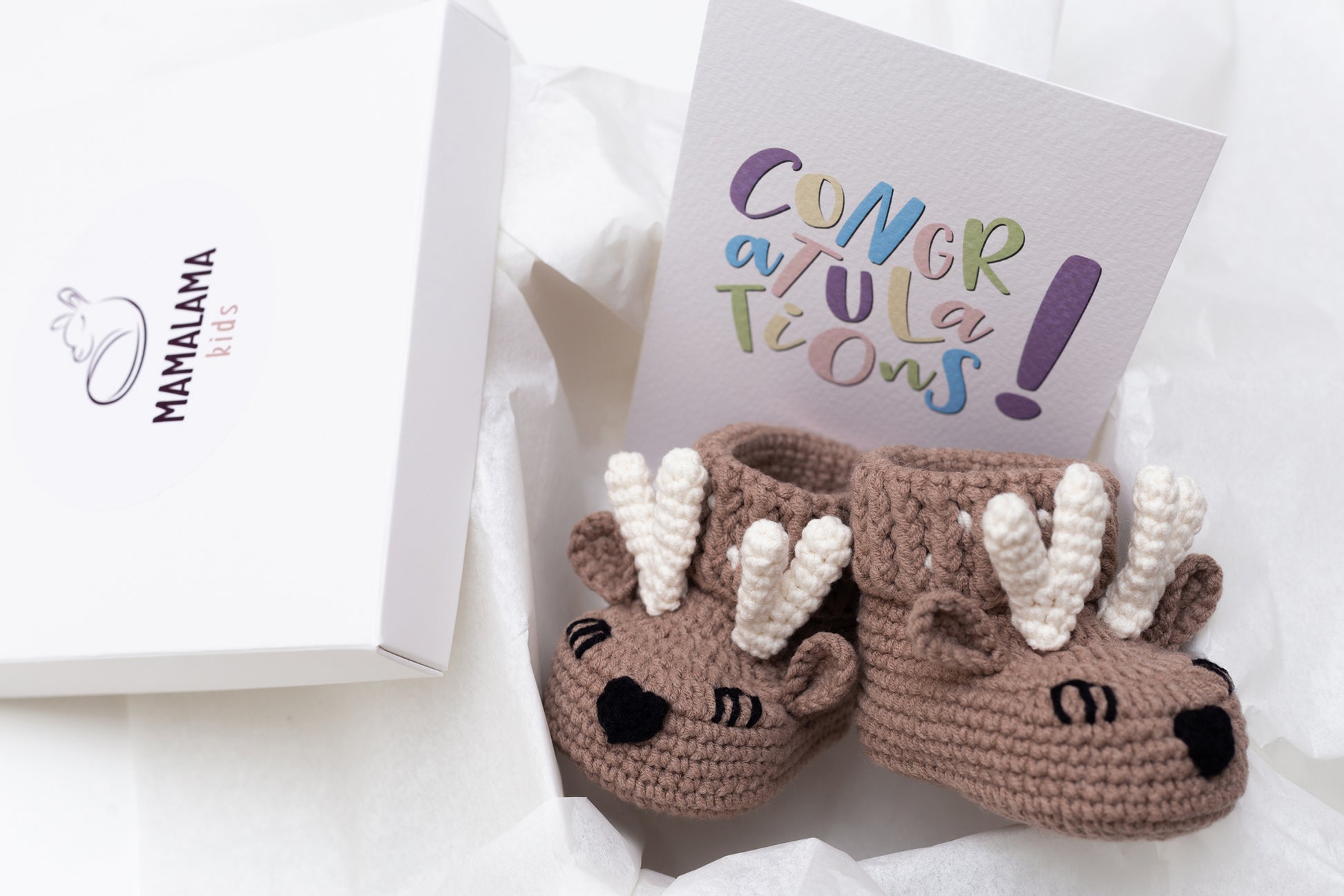 Unique pregnancy gift box for mom to be with cute animal booties. Woodland deer newborn soft sole shoes congratulations basket.