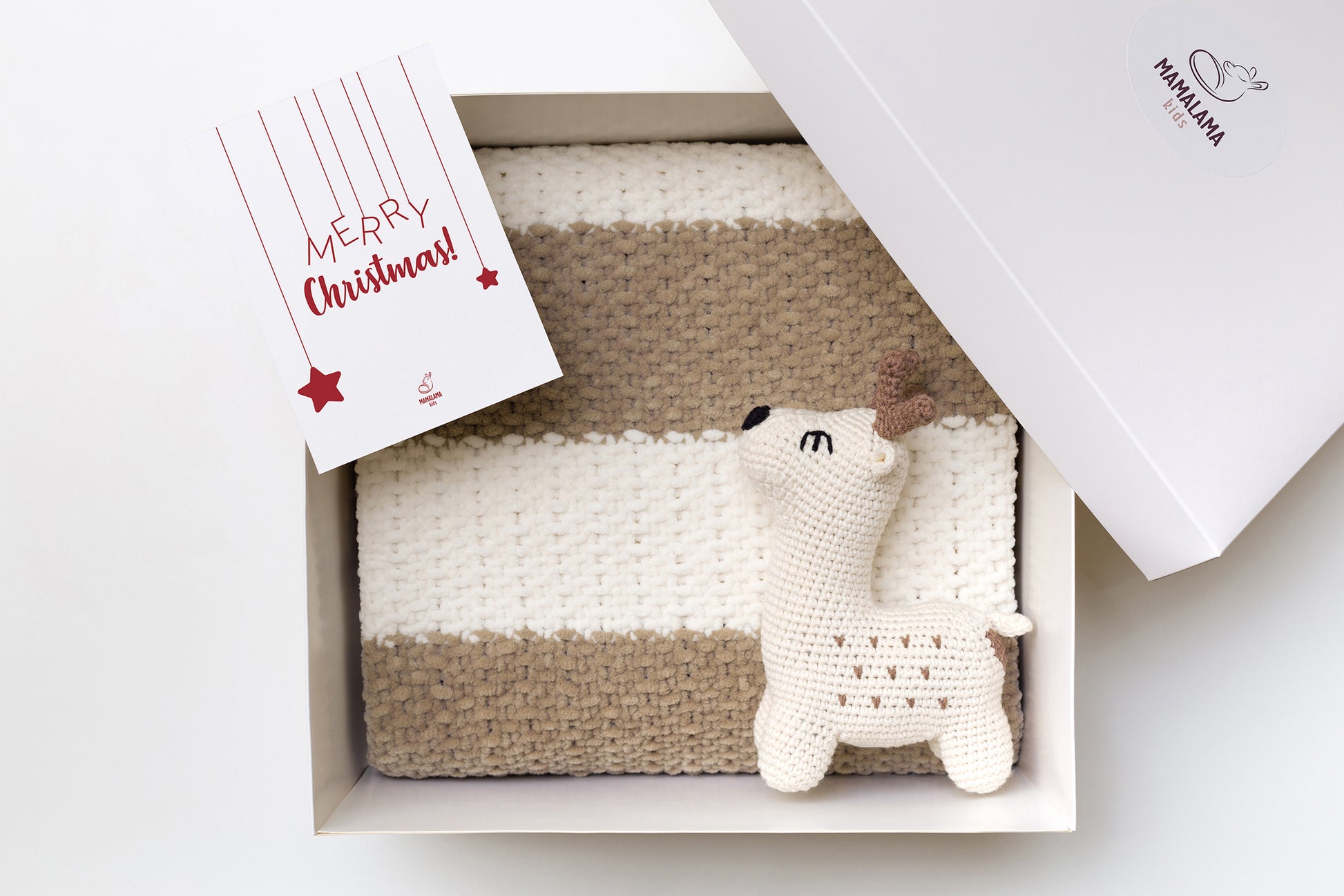 This is a Christmas gift box set which consists of a blanket, toy, tissue paper, and a cute white box. The blanket is 100x80 cm or 39.3x31.4 inches.