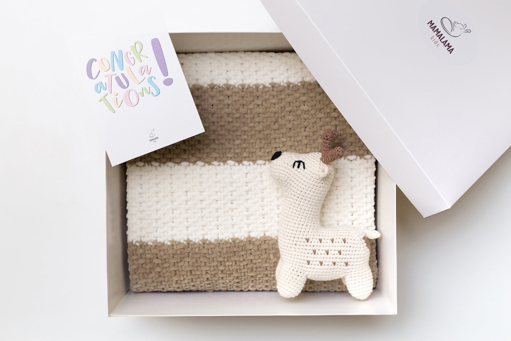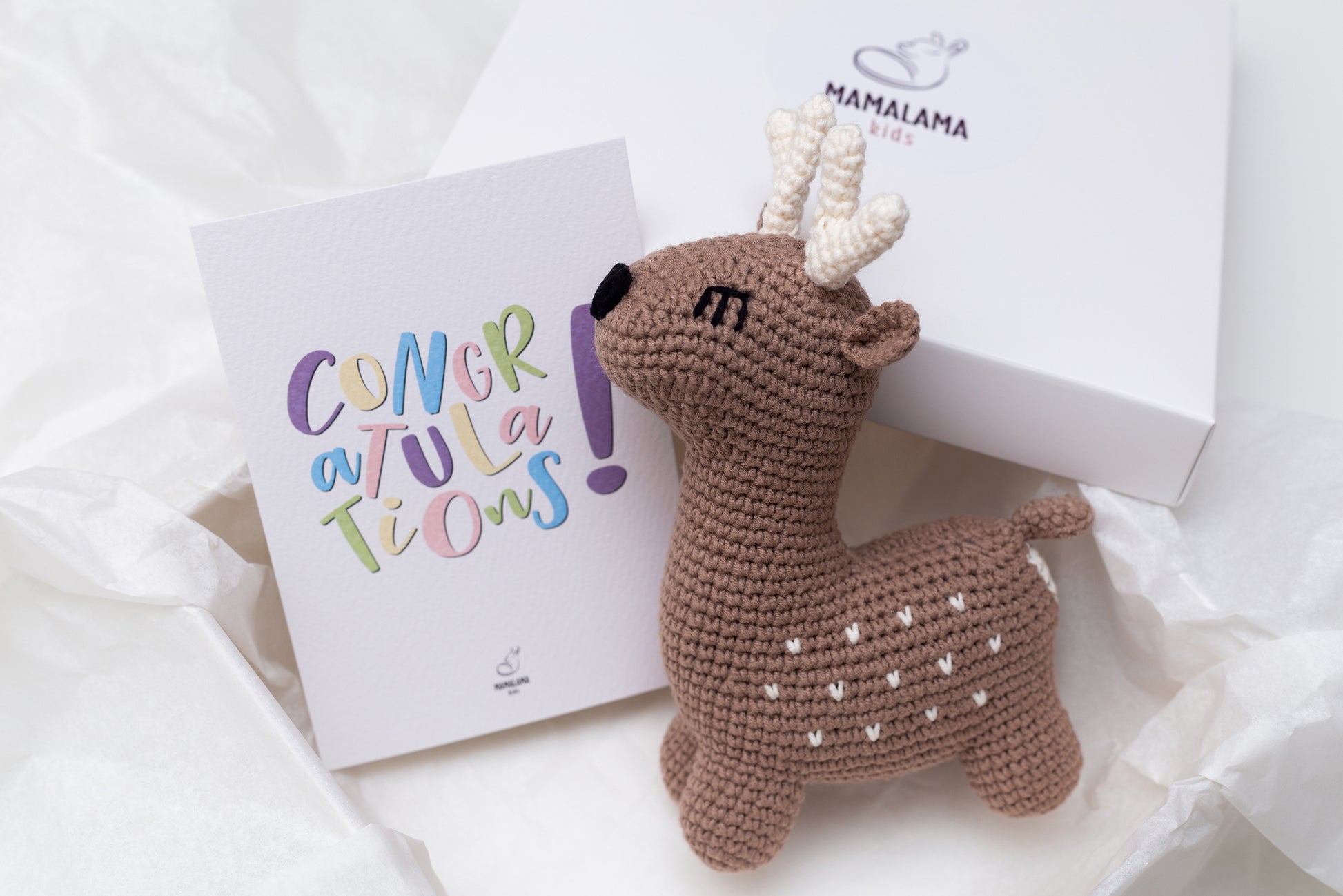 Unique pregnancy gift box for mom to be with cute animal toy. Woodland deer newborn soft congratulations basket.