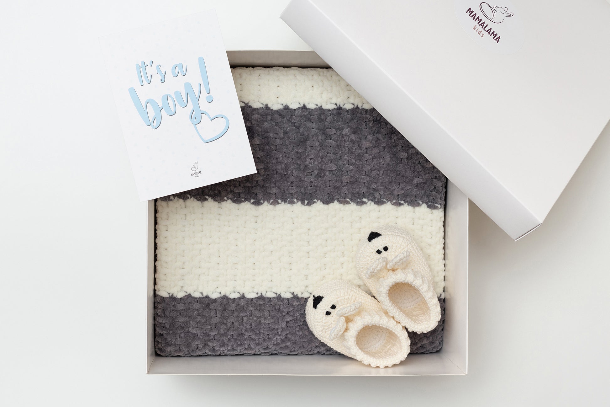 It's a Boy Baby blanket & bunny booties gift box Gray