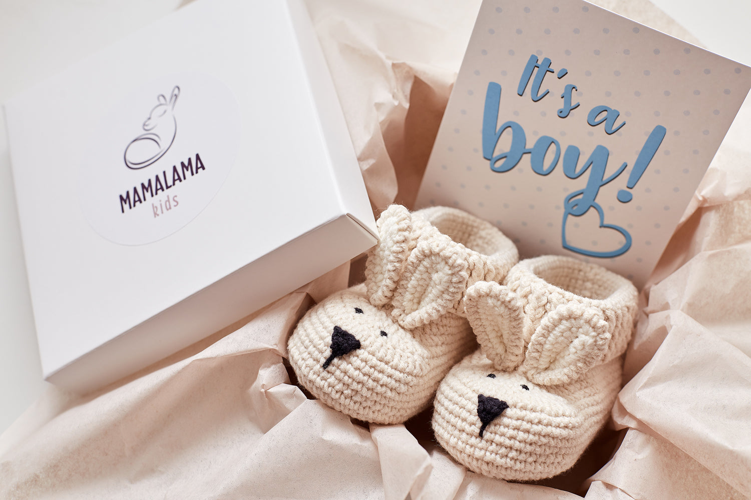 Unique It's a Boy pregnancy gift box for mom to be with cute animal booties. Farm bunny newborn soft sole shoes congratulations basket.