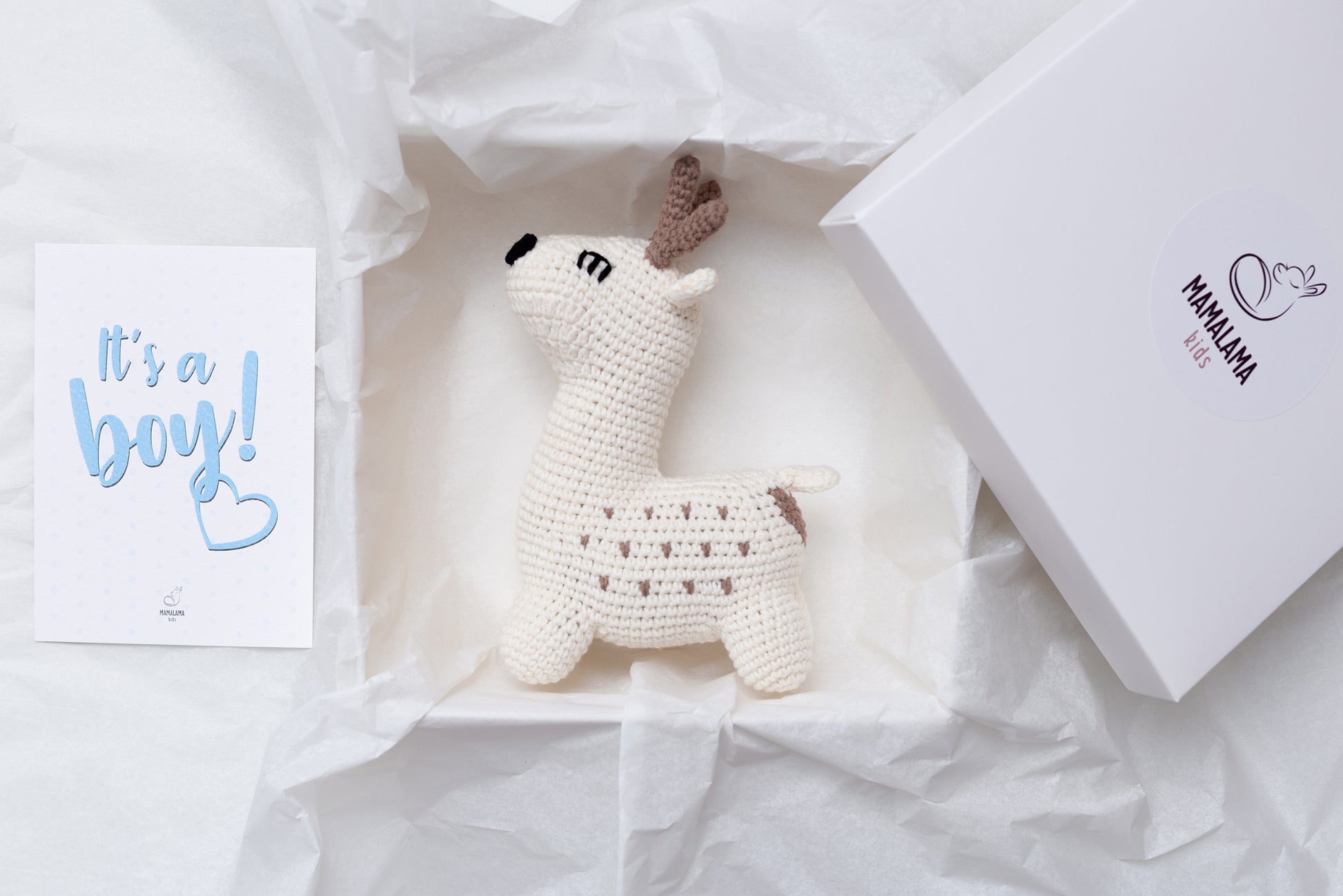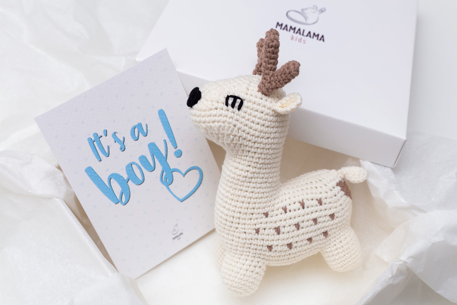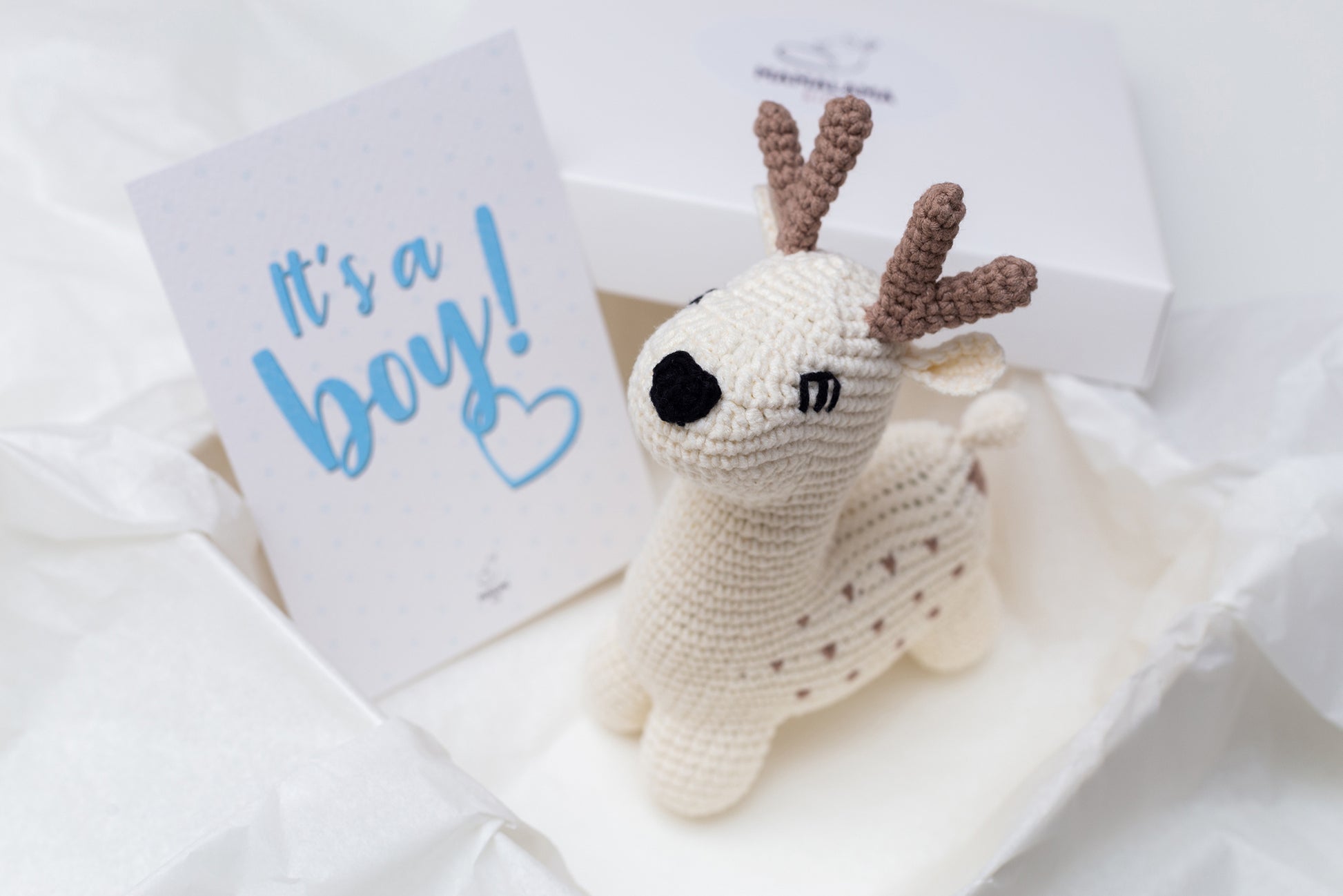 Unique It's a Boy pregnancy gift box for mom to be with cute animal toy. Woodland deer newborn soft congratulations basket.