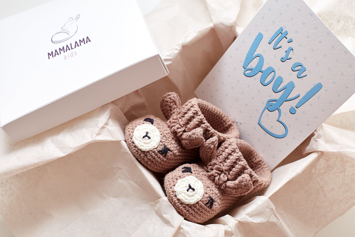 It's a Boy Llama booties gift box Brown