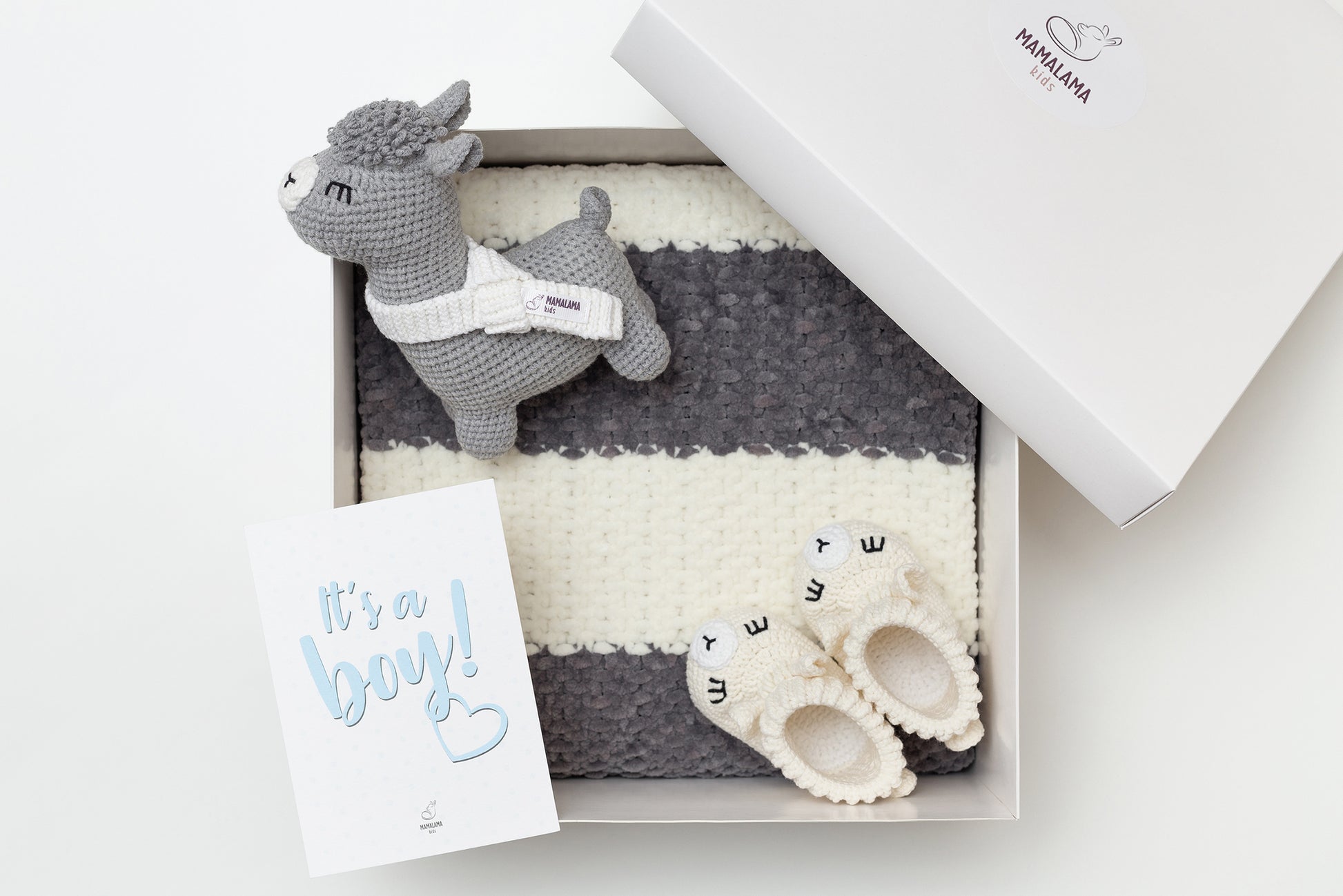 It's a Boy Llama toy & blanket & booties gift box Gray