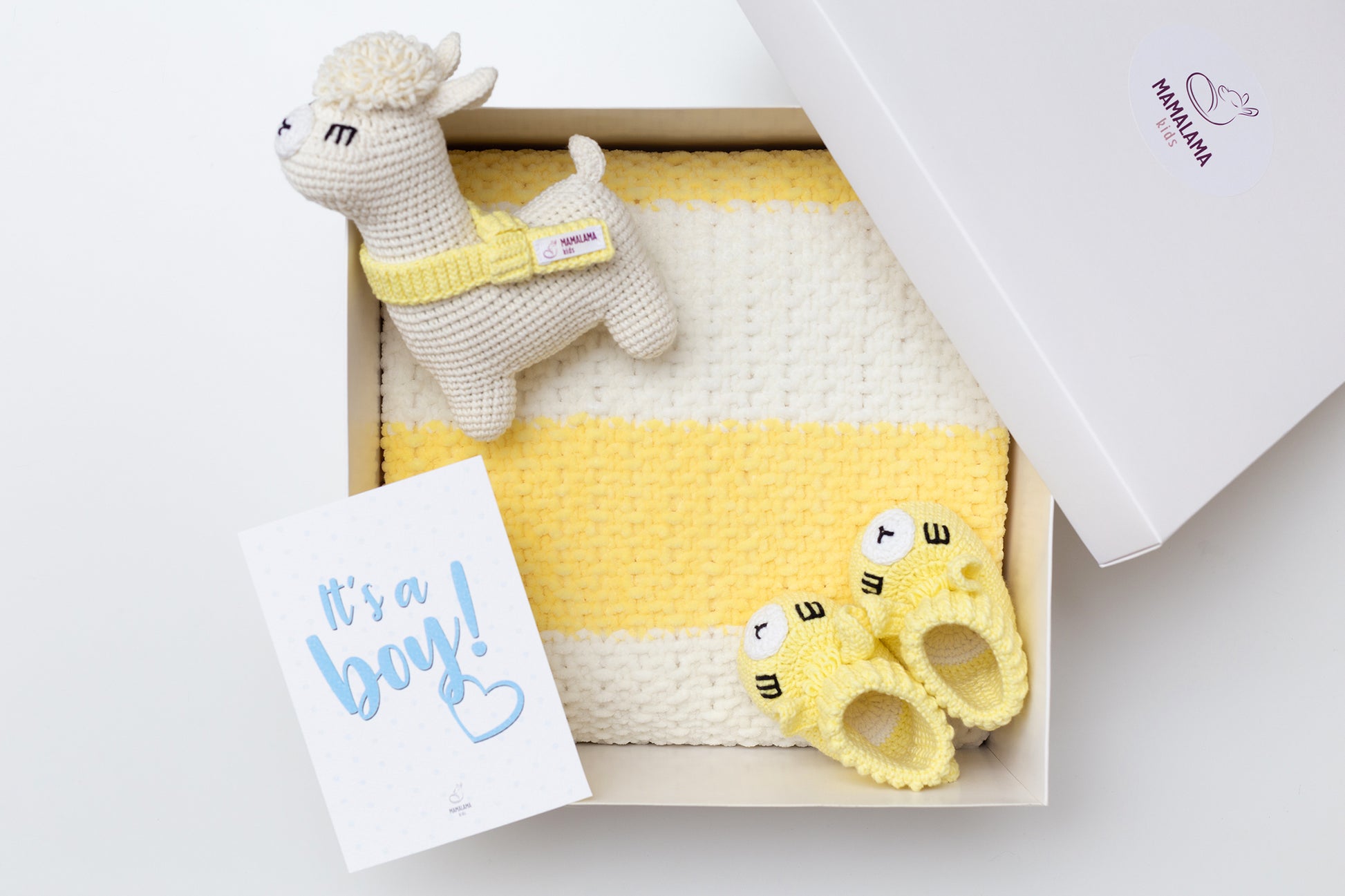 It's a Boy Llama toy & blanket & booties gift box Yellow