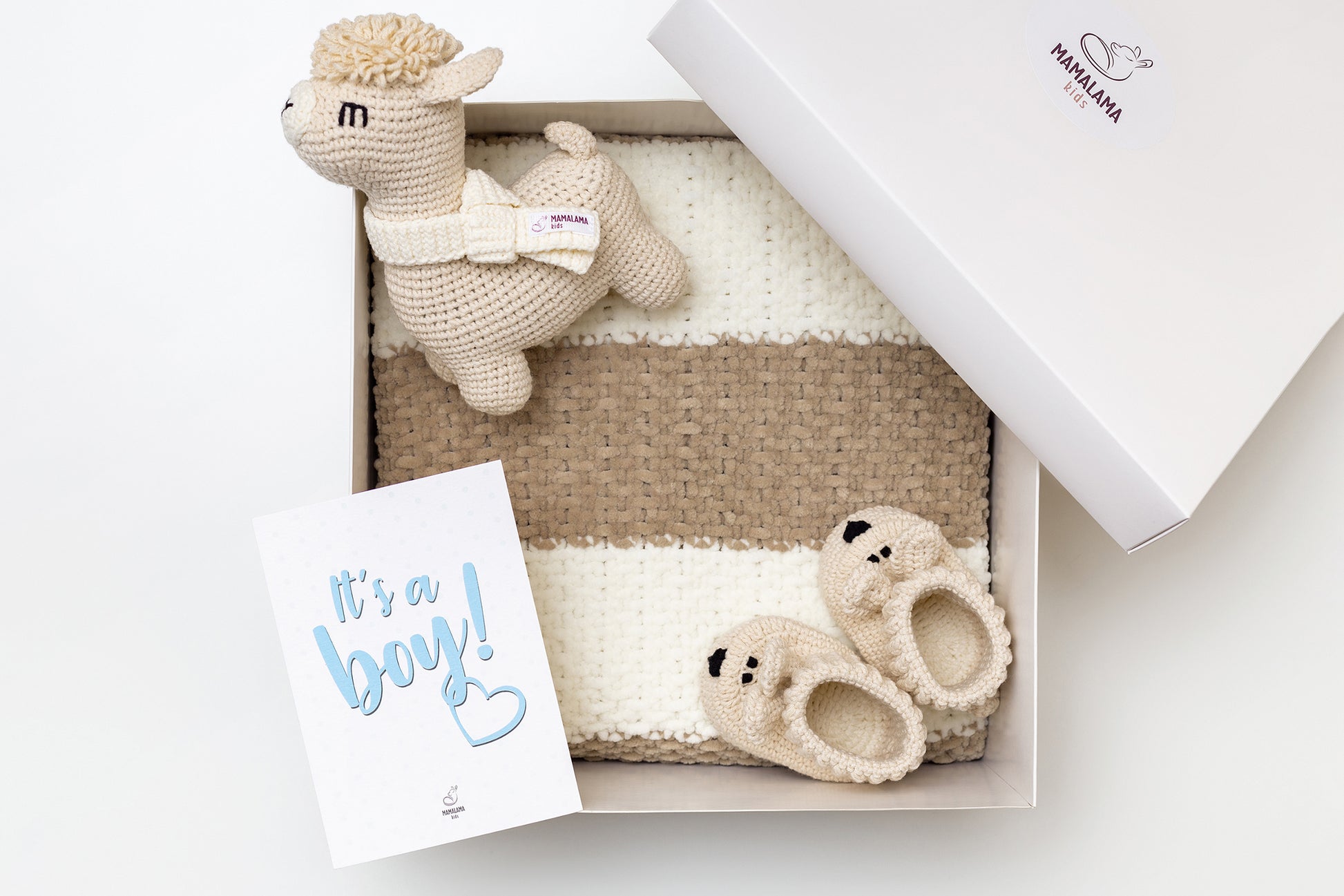 It's a Boy Llama toy & blanket & bunny booties gift box Beige