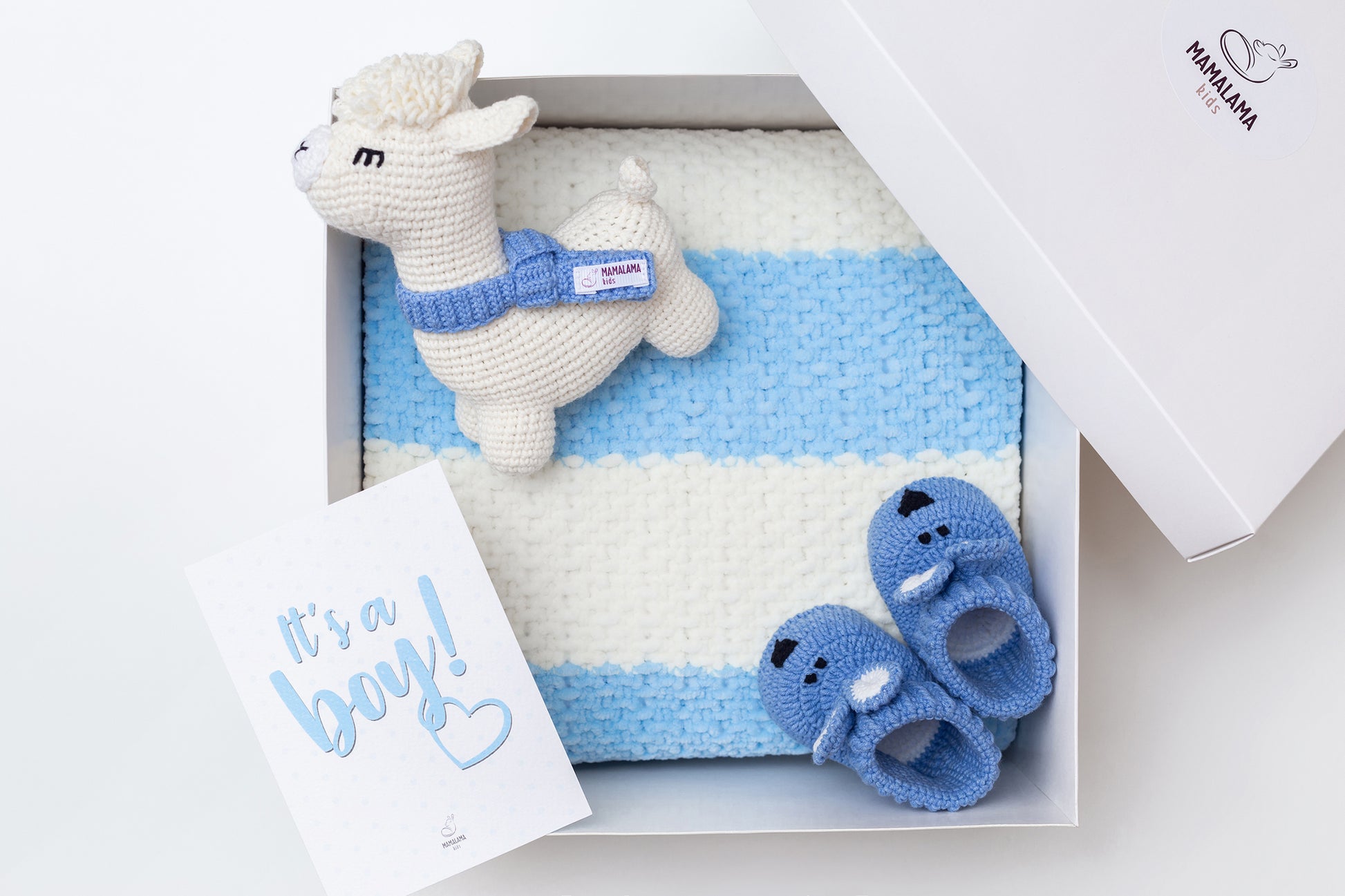 It's a Boy Llama toy & blanket & bunny booties gift box Blue