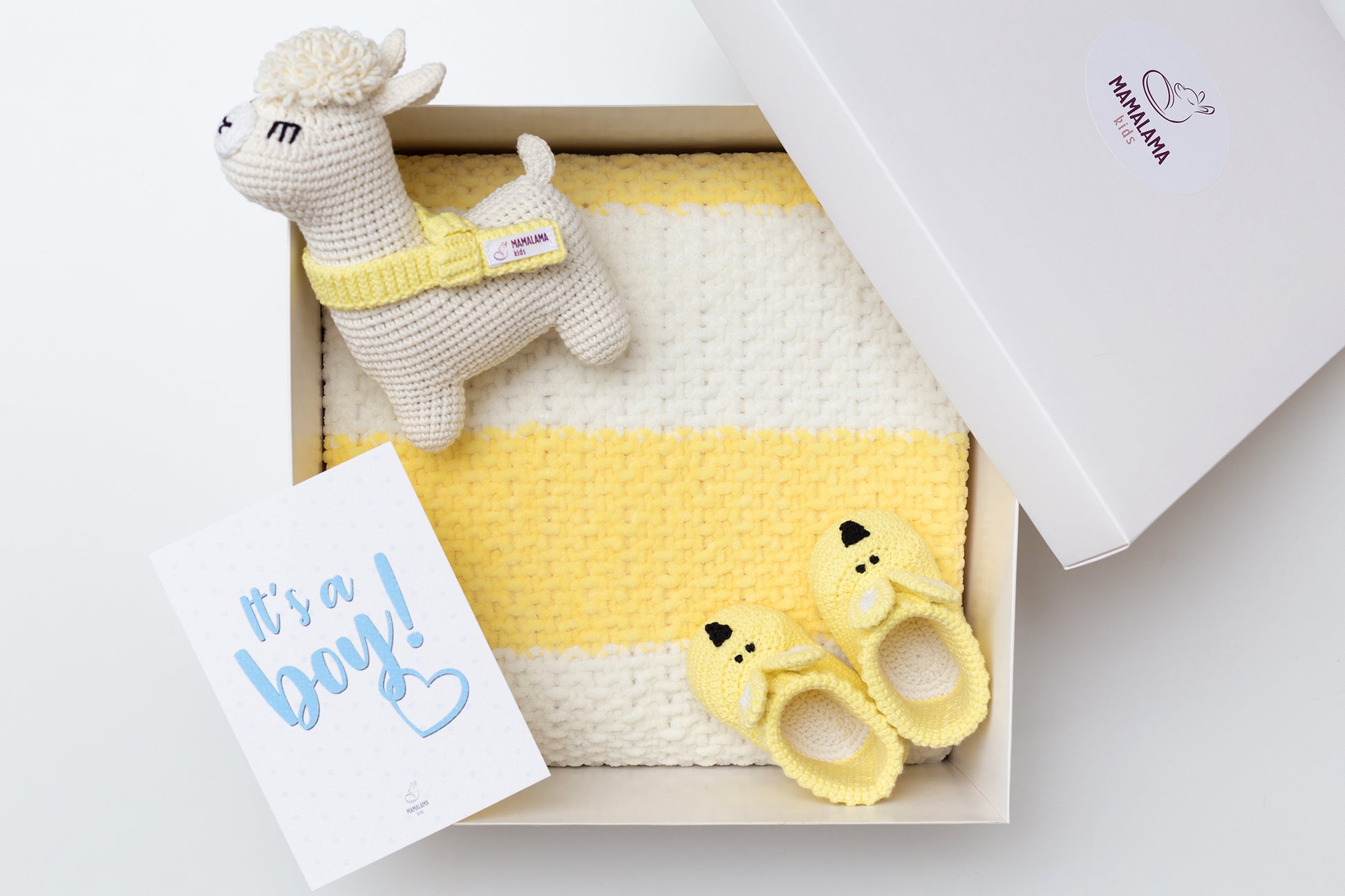 It's a Boy Llama toy & blanket & bunny booties gift box Yellow