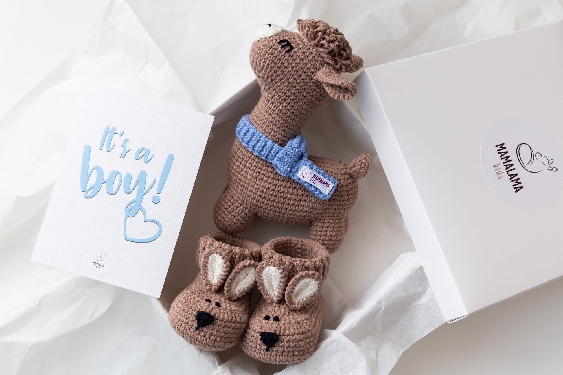 It's a Boy Llama toy & bunny booties gift box Brown