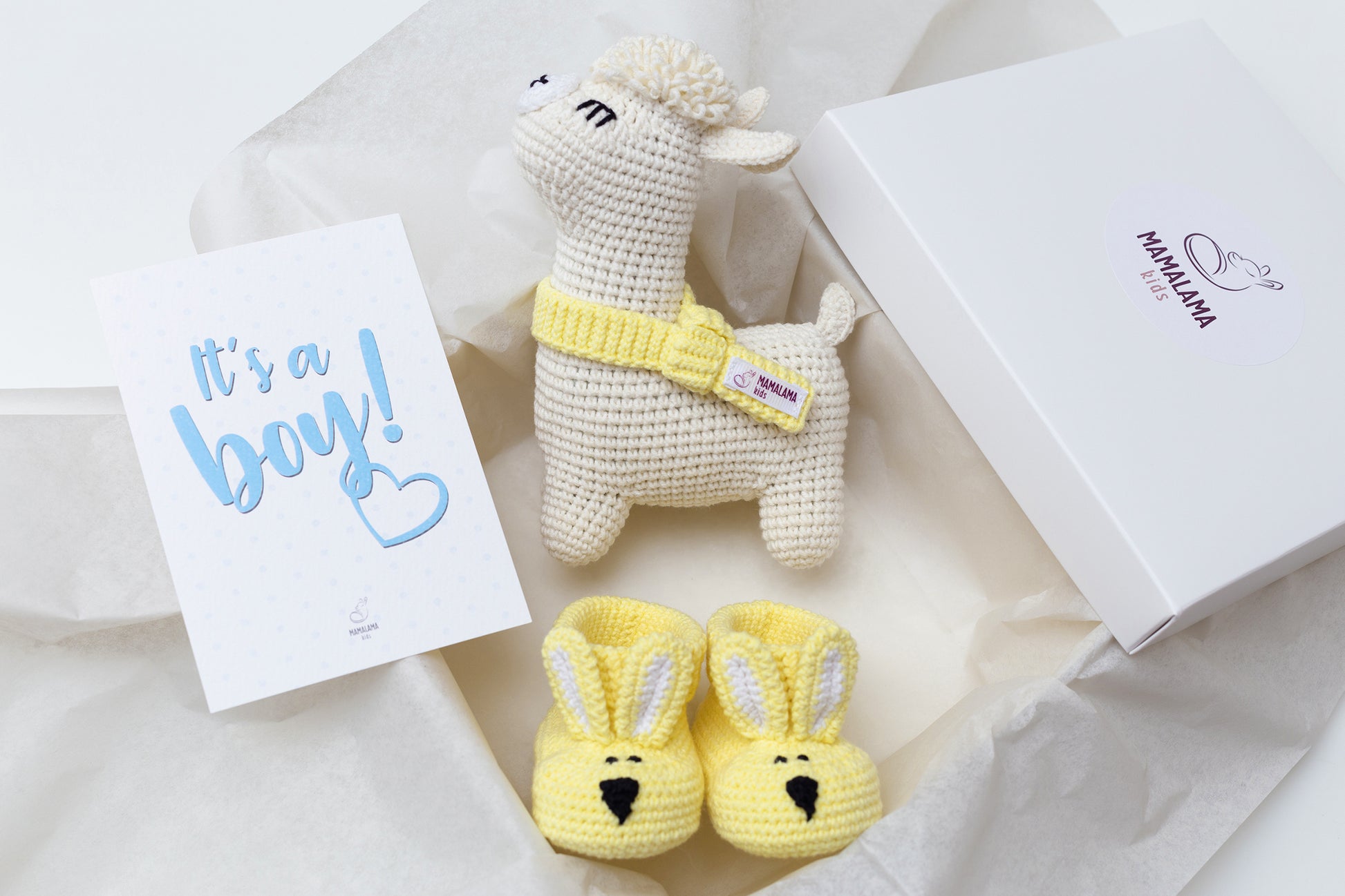 It's a Boy Llama toy & bunny booties gift box Yellow Off white
