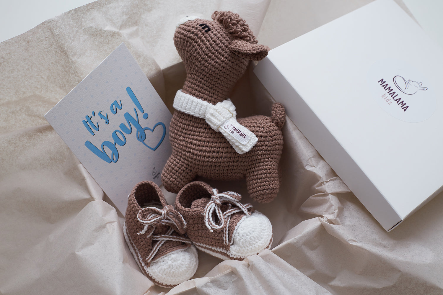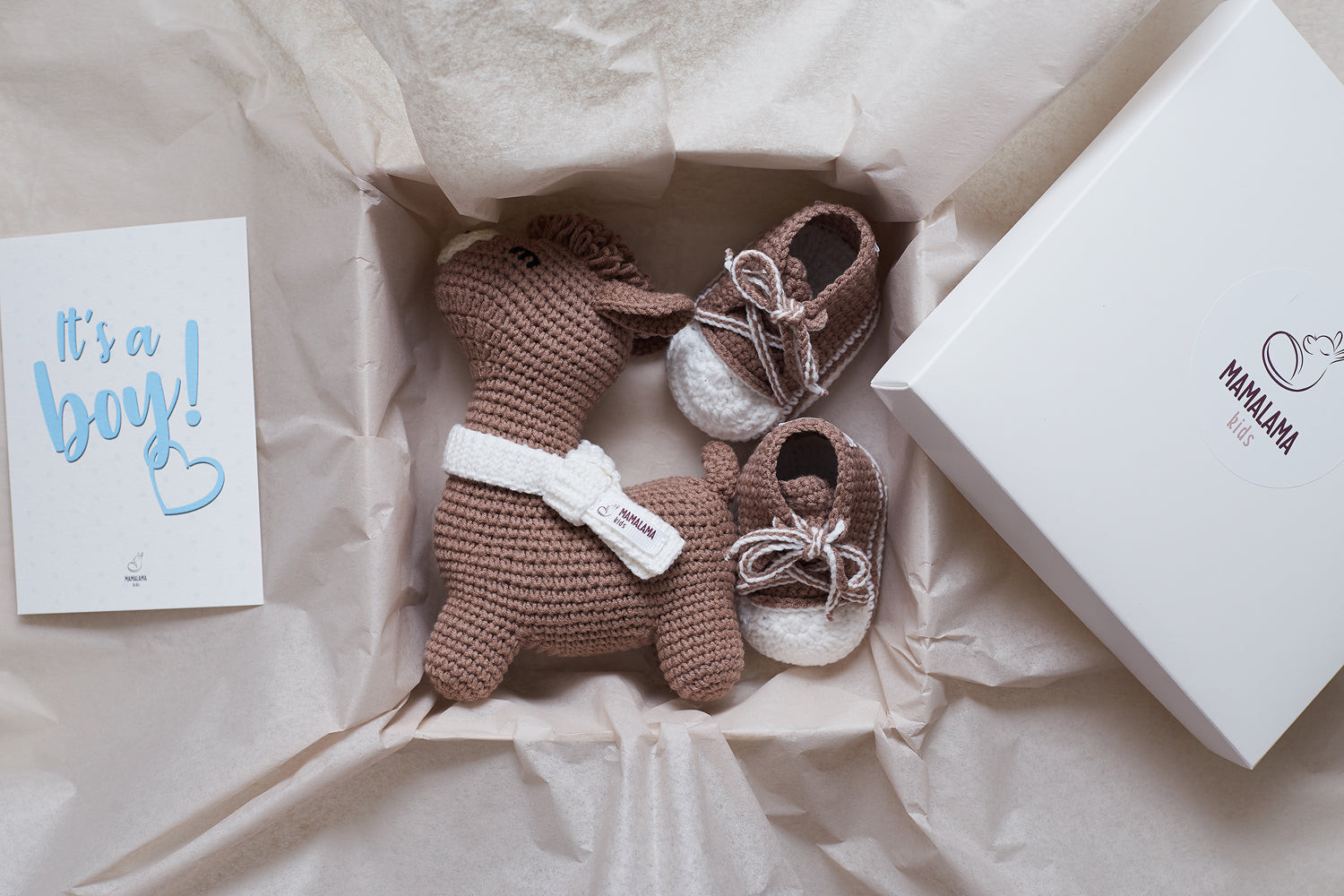 This is a gift box set which consists of a toy, booties, tissue paper, and a cute white box.