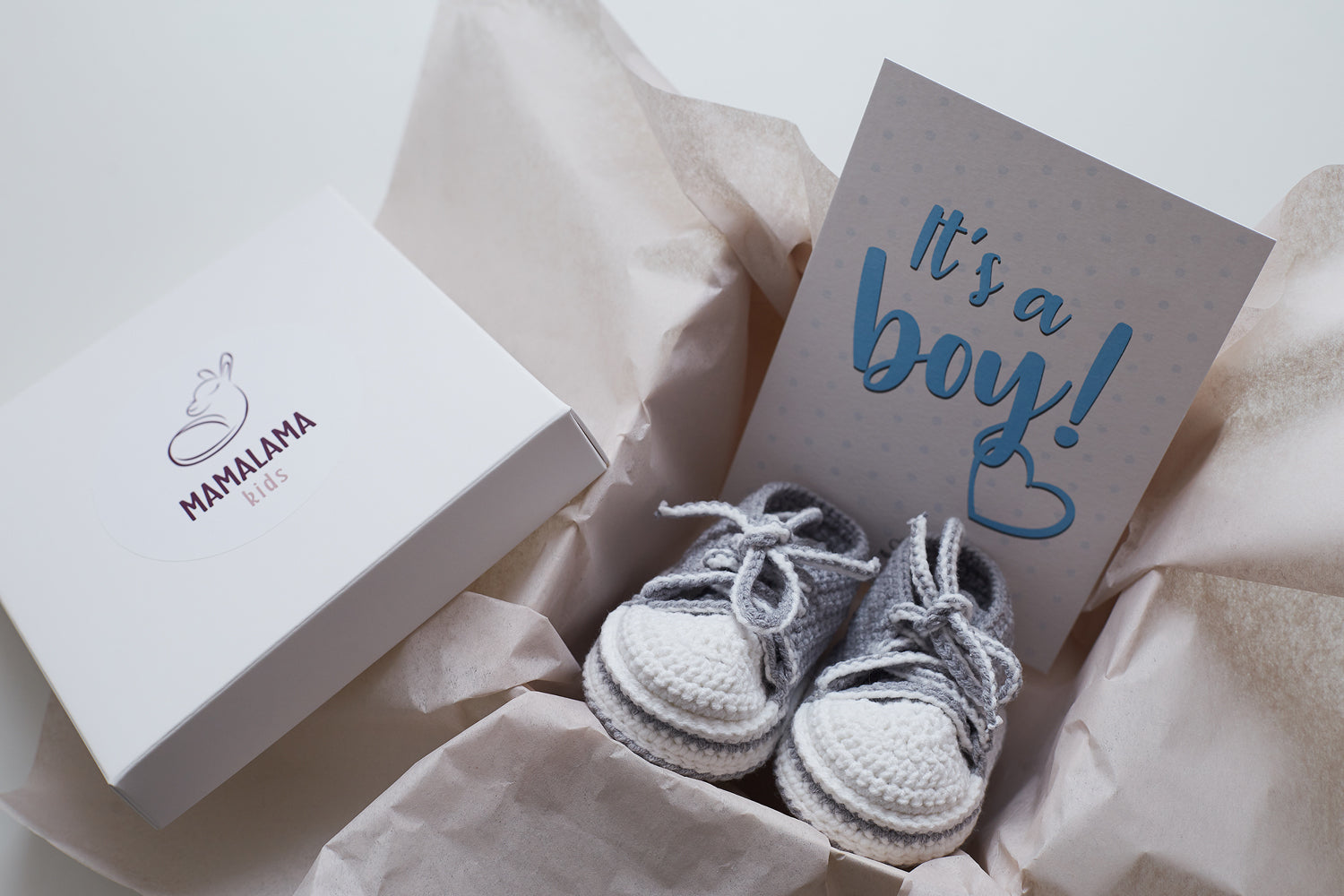 Unique pregnancy gift box pregnant woman or for mom to be with cute sneakers booties. Newborn soft sole shoes congratulations basket.