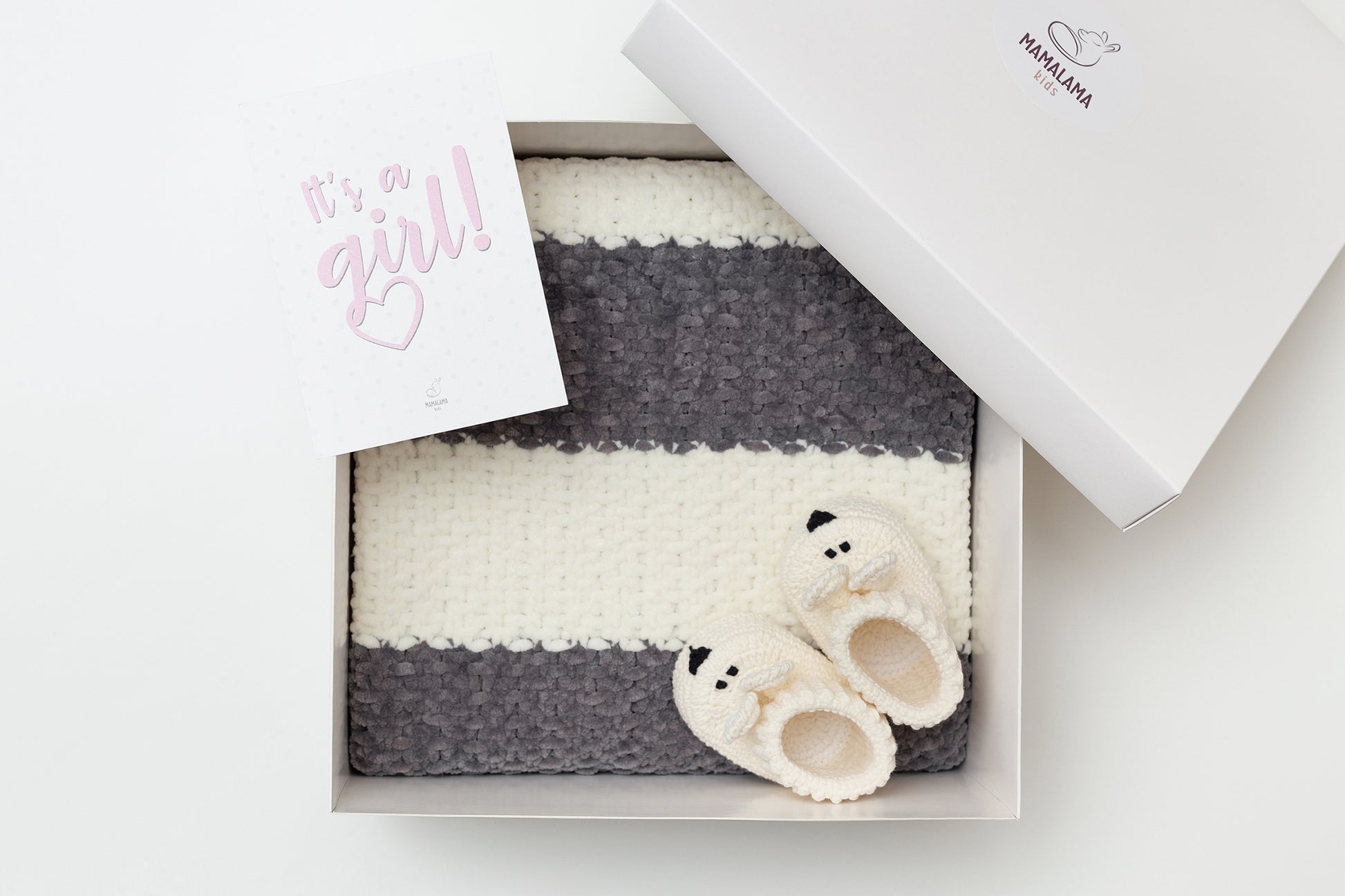 This is a gift box set that consists of a blanket, booties, tissue paper, and a cute white box. The blanket is 100x80 cm or 39.3x31.4 inches.