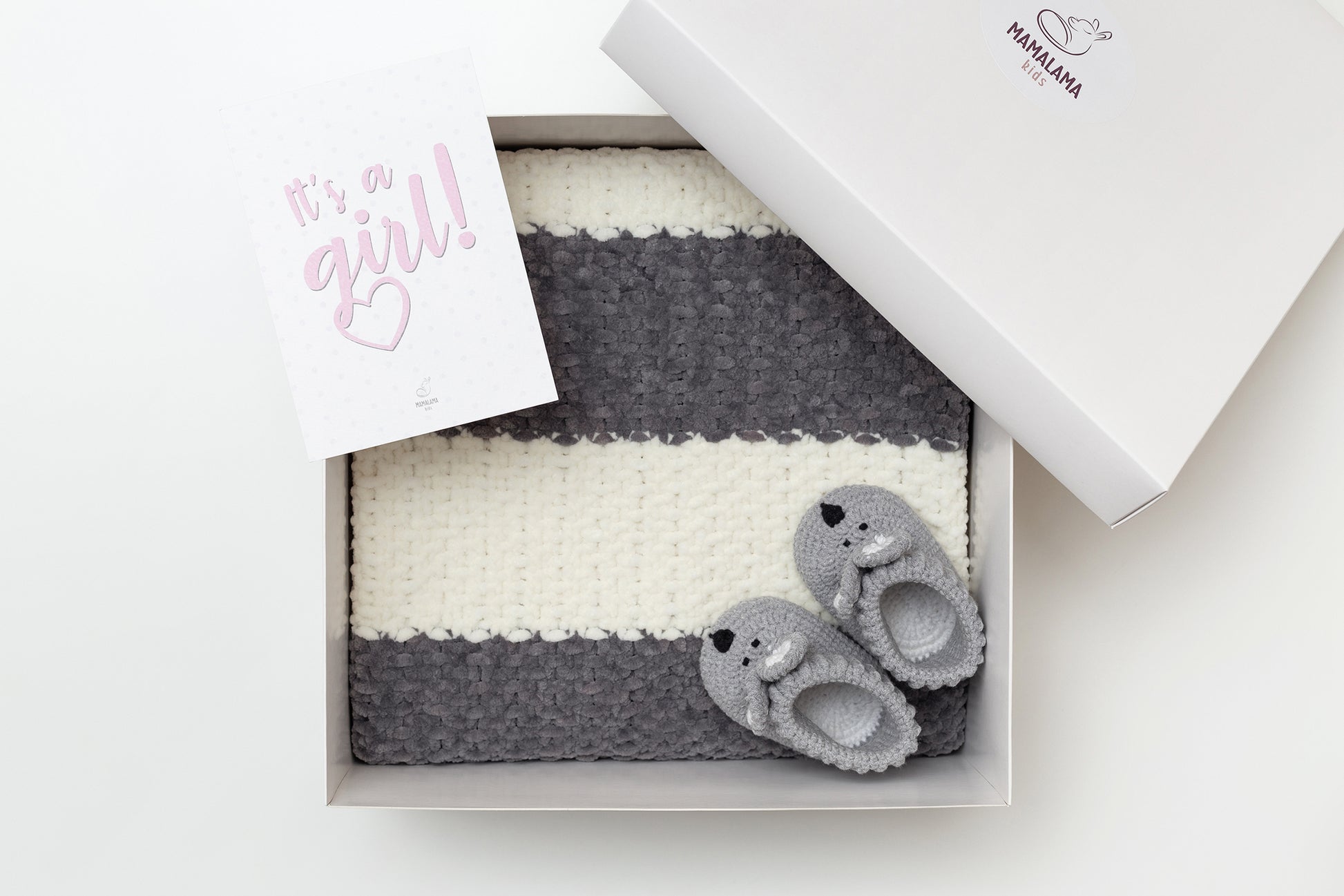 This is a gift box set that consists of a blanket, booties, tissue paper, and a cute white box. The blanket is 100x80 cm or 39.3x31.4 inches.