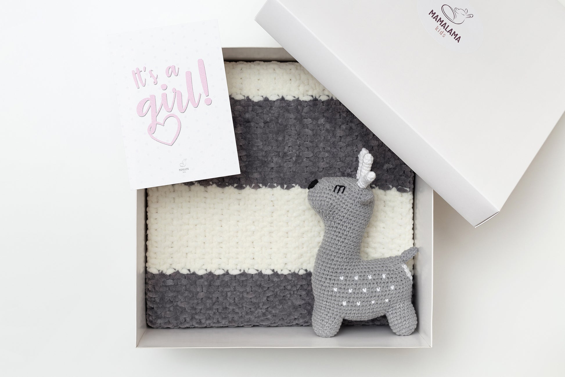 This is a gift box set which consists of a blanket, toy, tissue paper, and a cute white box. The blanket is 100x80 cm or 39.3x31.4 inches.