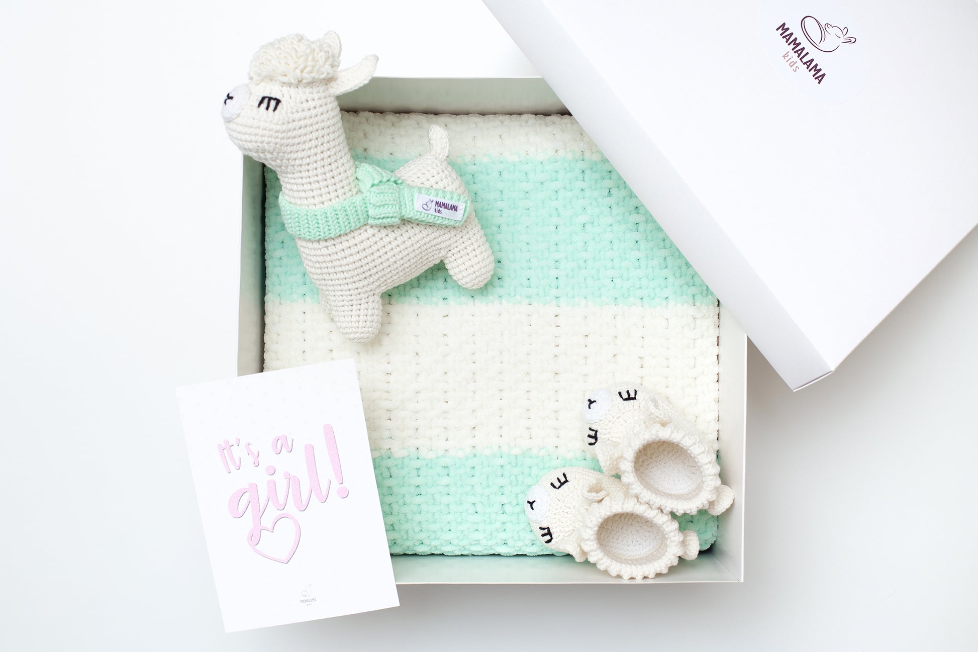 It's a Girl Llama toy & blanket & booties gift box Grint mint