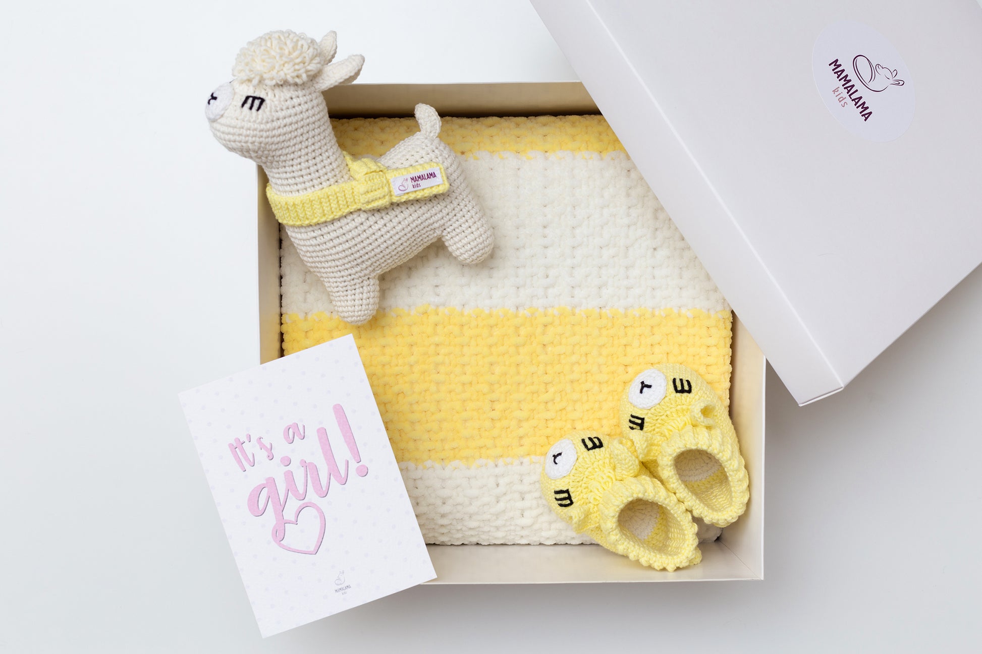It's a Girl Llama toy & blanket & booties gift box Yellow