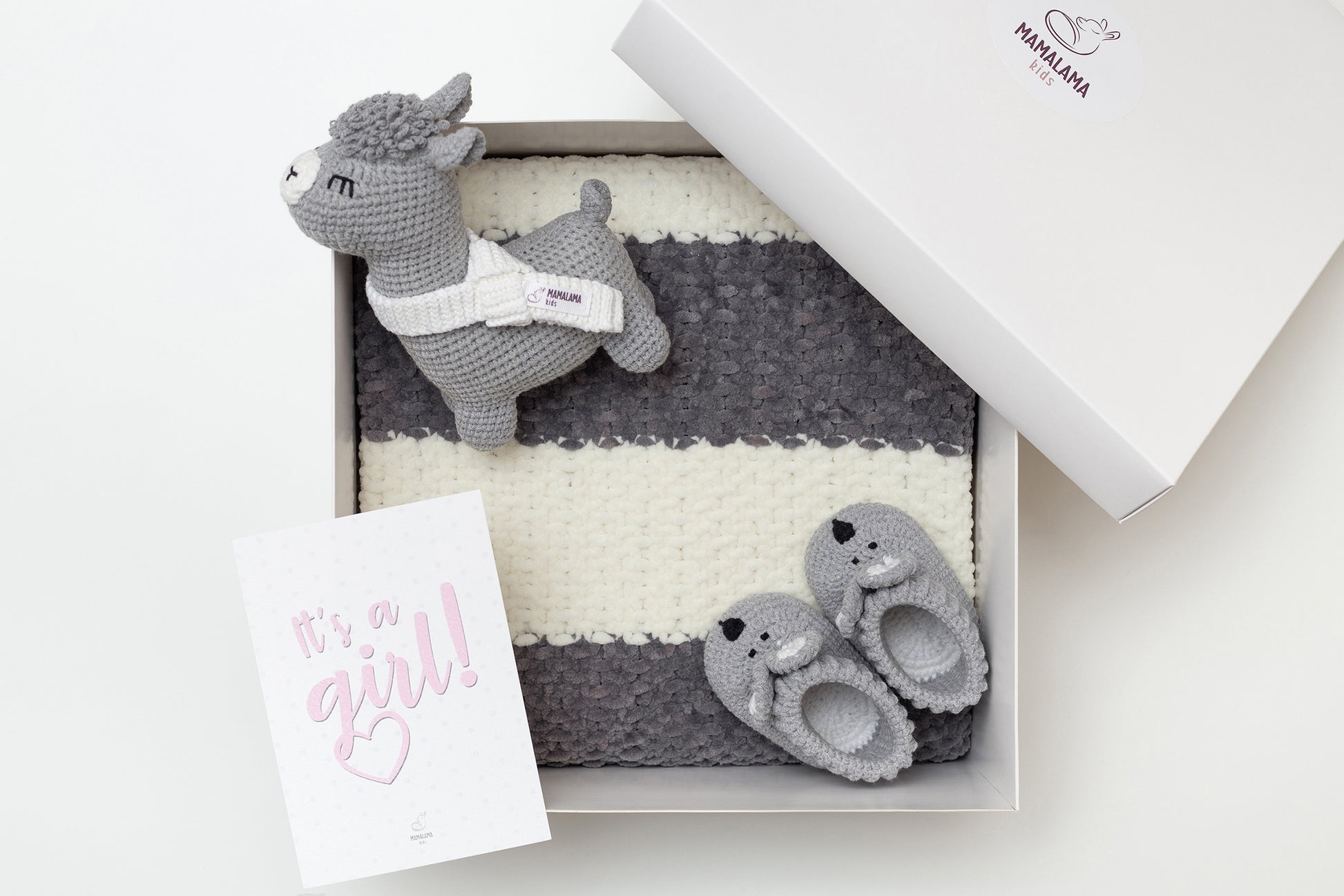 It's a Girl Llama toy & blanket & bunny booties gift box Gray