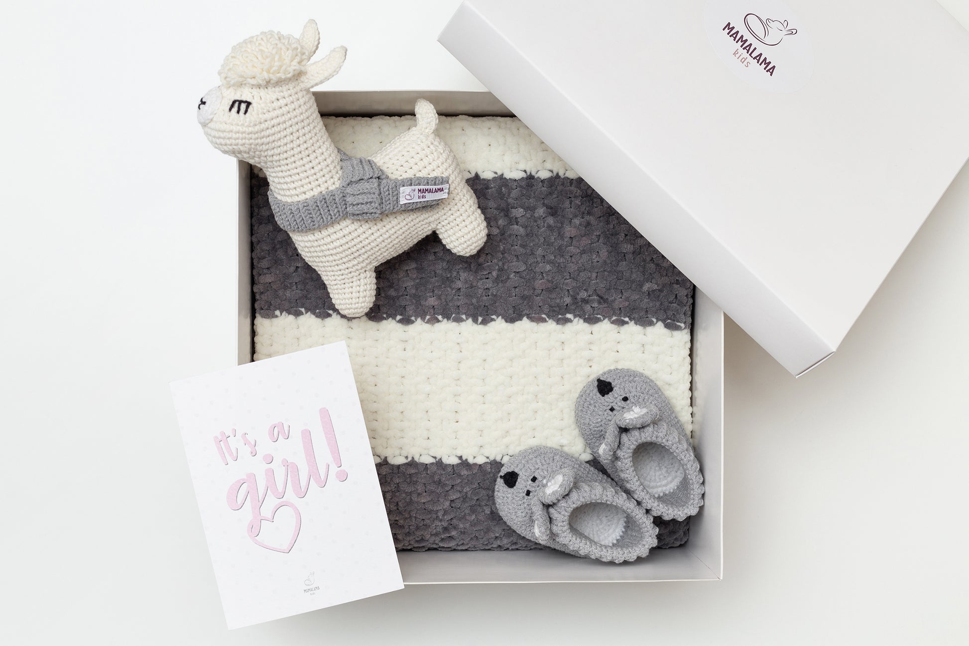 It's a Girl Llama toy & blanket & bunny booties gift box Gray