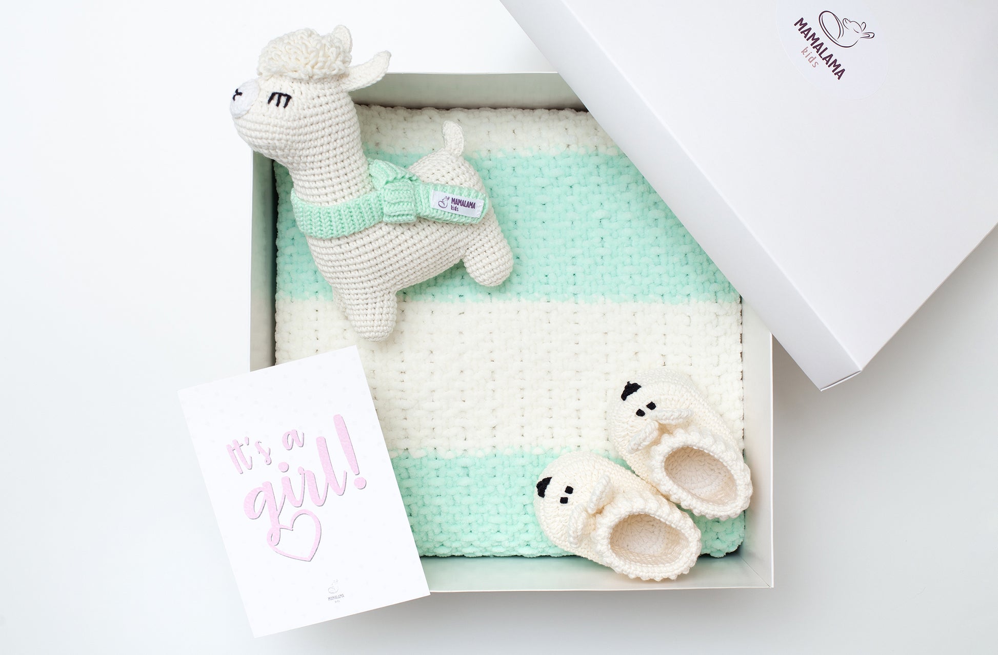 It's a Girl Llama toy & blanket & bunny booties gift box Green mint