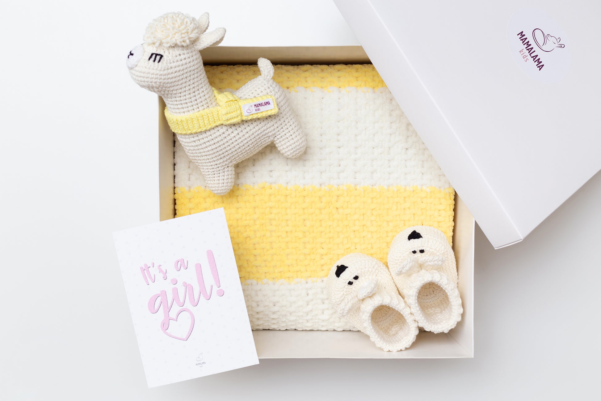 It's a Girl Llama toy & blanket & bunny booties gift box Lemon