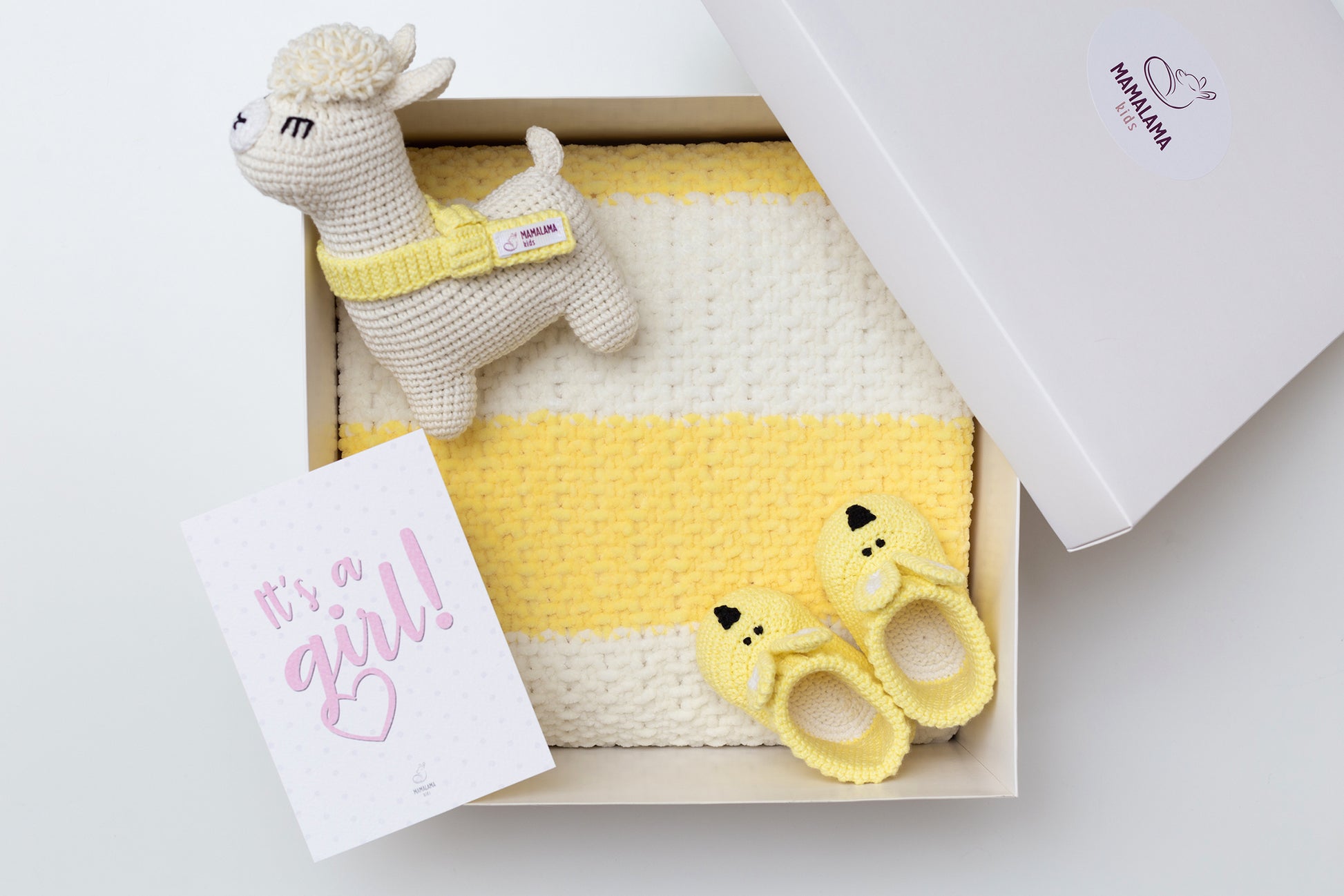 It's a Girl Llama toy & blanket & bunny booties gift box Lemon