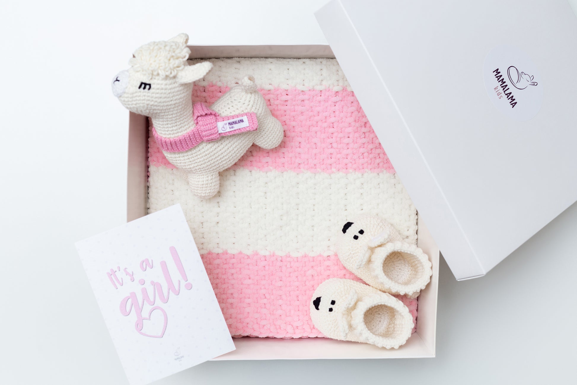It's a Girl Llama toy & blanket & bunny booties gift box Pink