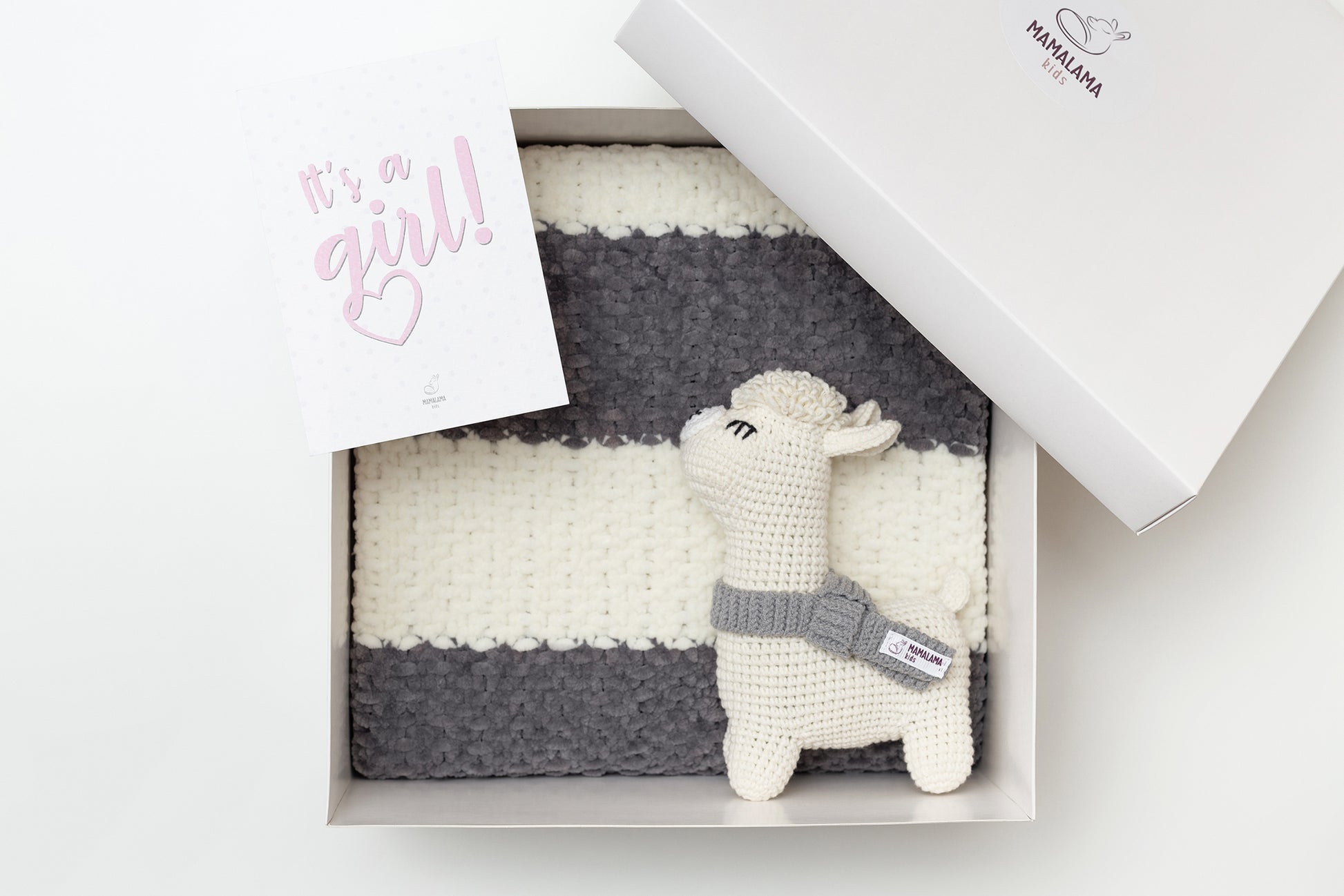 This is a gift box set which consists of a blanket, toy, tissue paper, and a cute white box. The blanket is 100x80 cm or 39.3x31.4 inches.