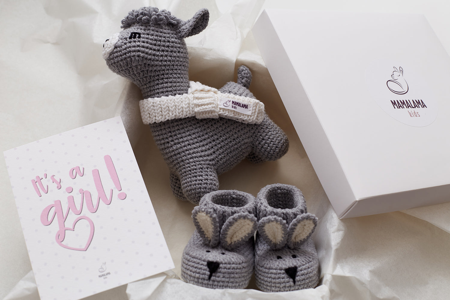 This is a gift box set which consists of a toy, booties, tissue paper, and a cute white box.