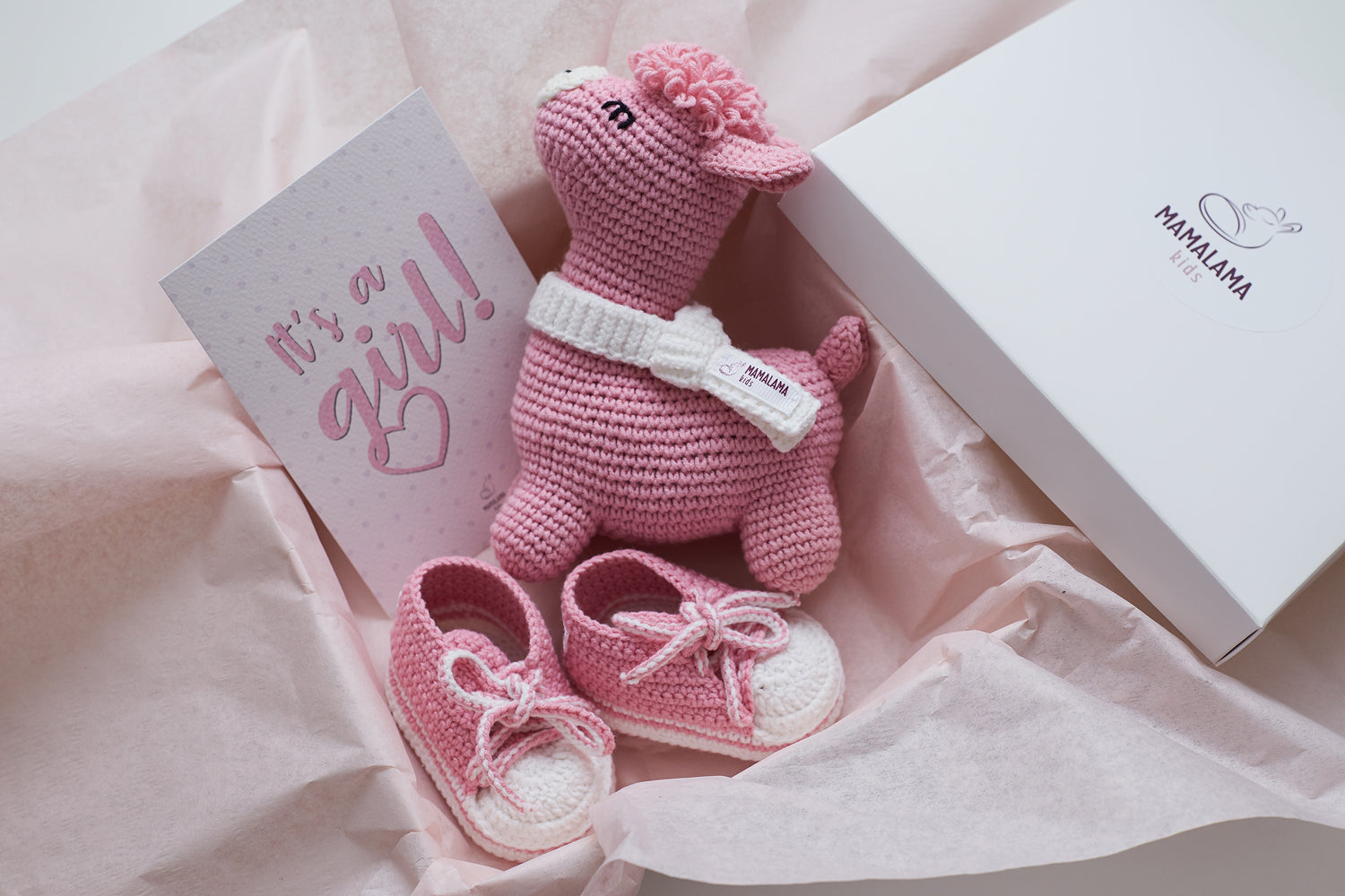 This is a gift box set which consists of a toy, booties, tissue paper, and a cute white box.