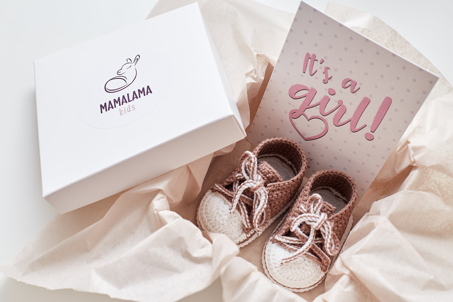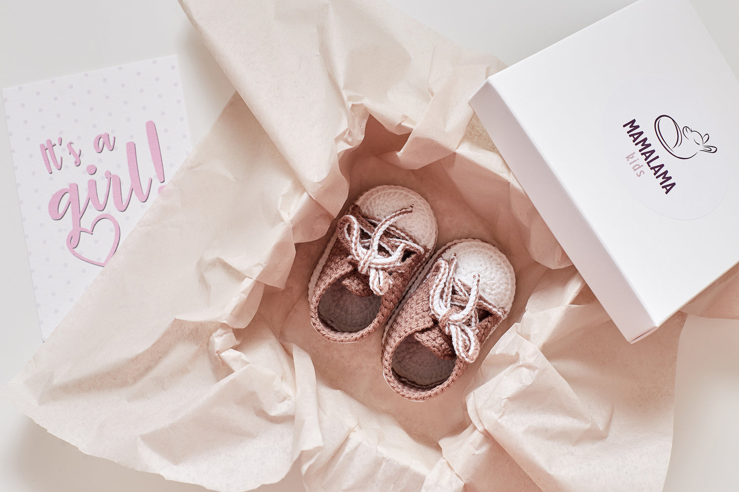 Unique pregnancy gift box pregnant woman or for mom to be with cute sneakers booties. Newborn soft sole shoes congratulations basket.