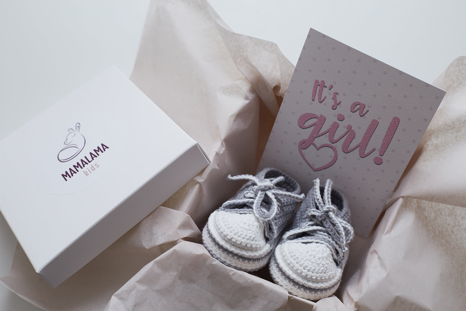 Unique pregnancy gift box pregnant woman or for mom to be with cute sneakers booties. Newborn soft sole shoes congratulations basket.