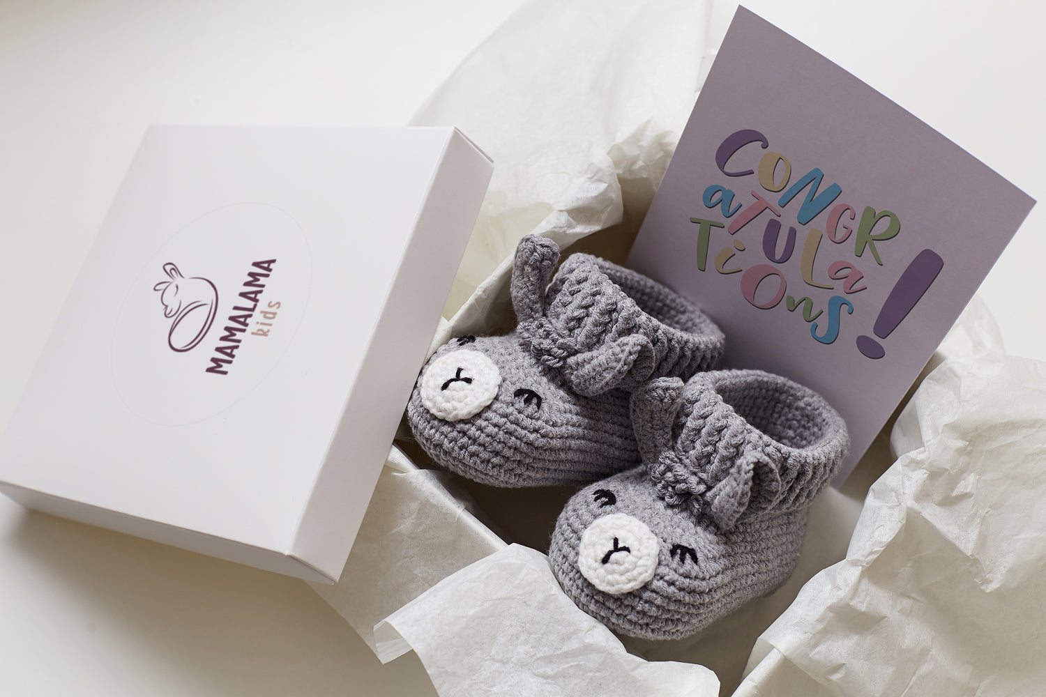 This is a gift box set which consists of booties, tissue paper, and a cute white box.