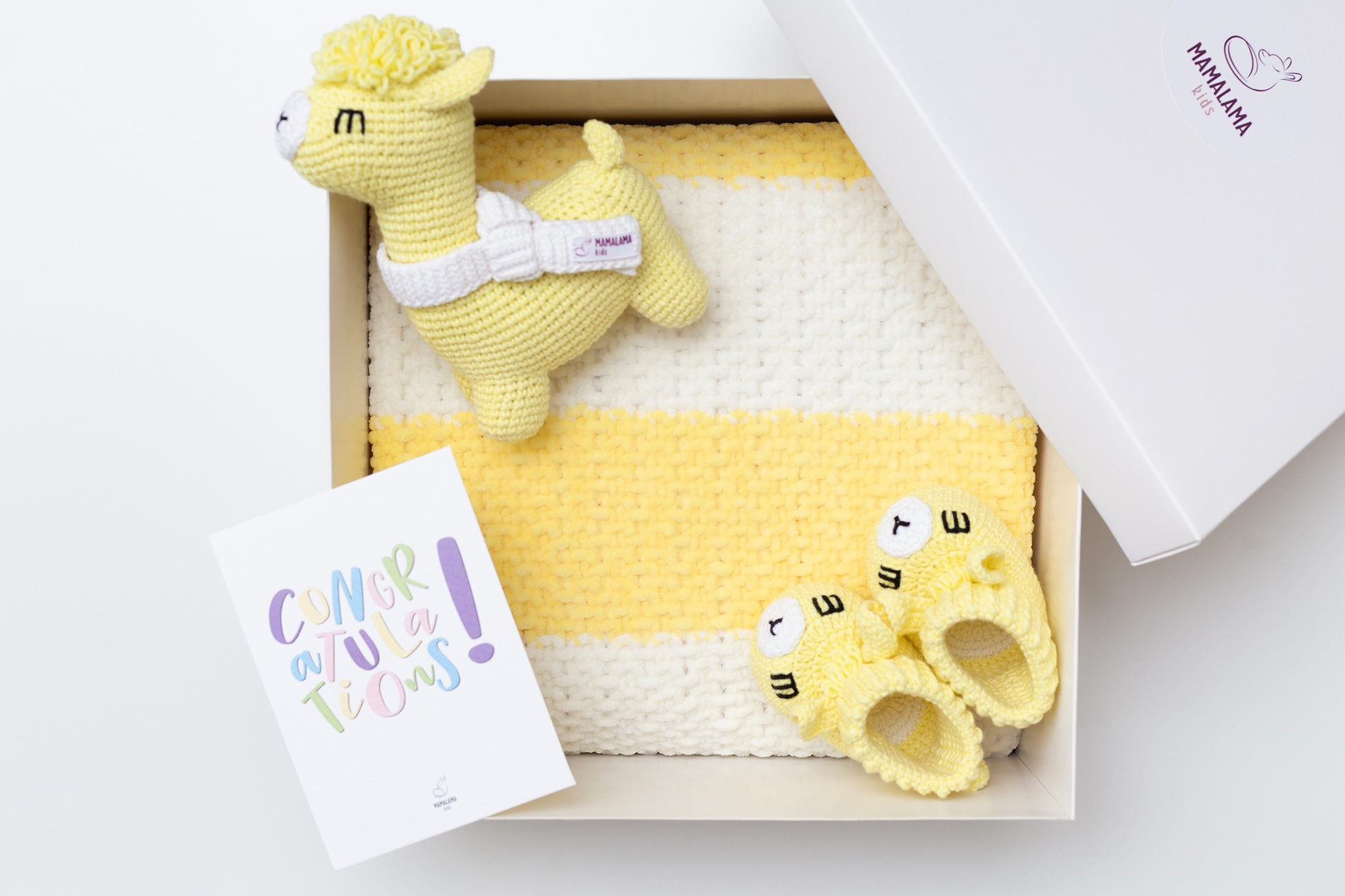 If you have any questions I am always in touch and reply asap! This is a gift box set which consists of a blanket, toy, booties, tissue paper, and a cute white box.