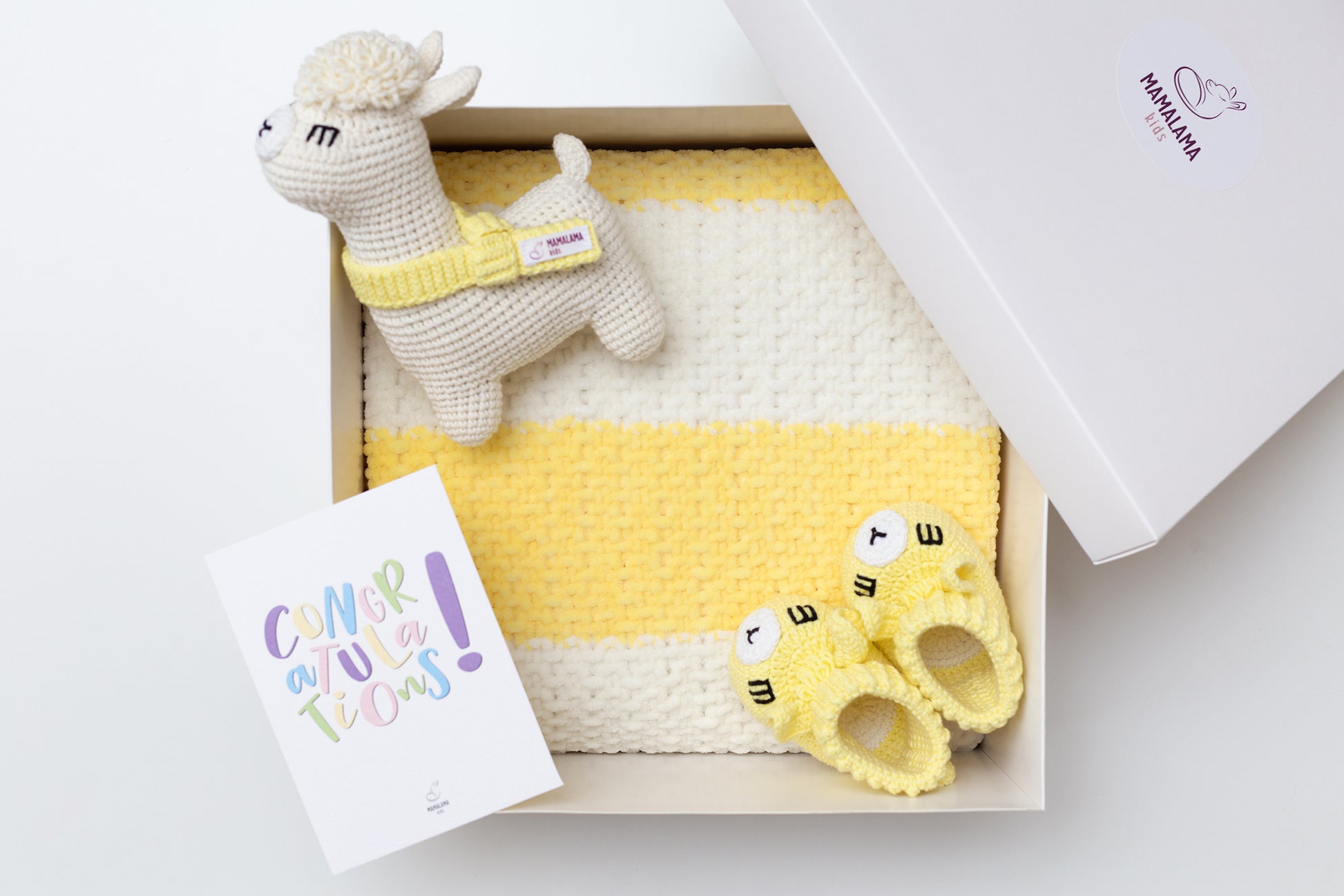If you have any questions I am always in touch and reply asap! This is a gift box set which consists of a blanket, toy, booties, tissue paper, and a cute white box.