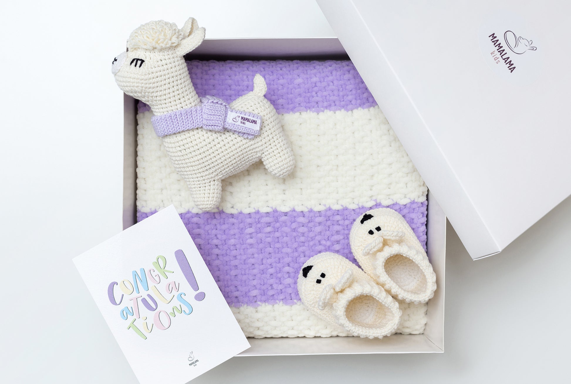 If you have any questions I am always in touch and reply asap! This is a gift box set which consists of a blanket, toy, booties, tissue paper, and a cute white box.