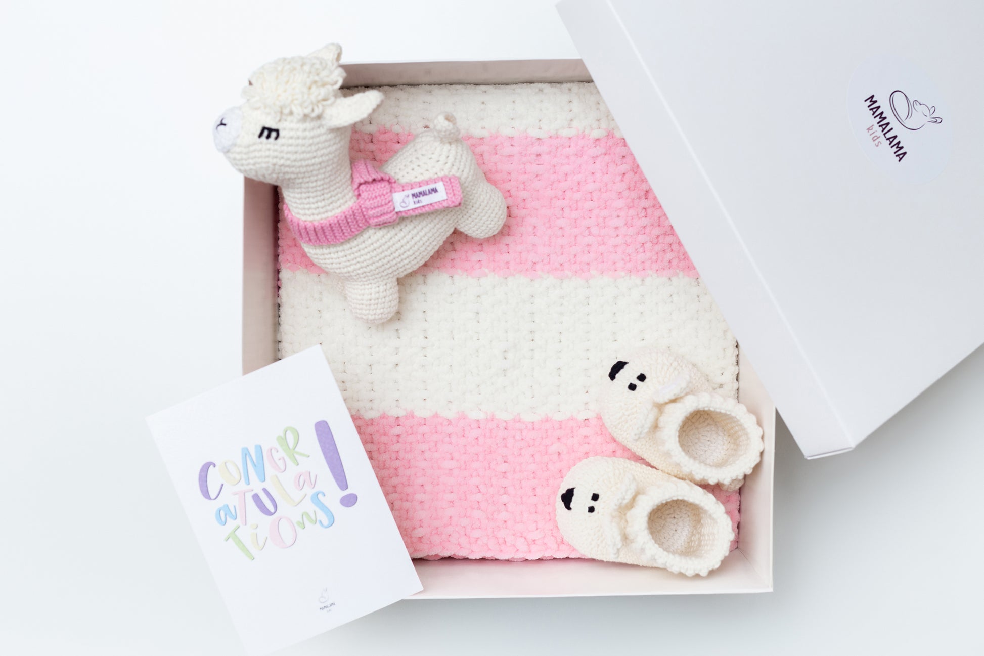 If you have any questions I am always in touch and reply asap! This is a gift box set which consists of a blanket, toy, booties, tissue paper, and a cute white box.