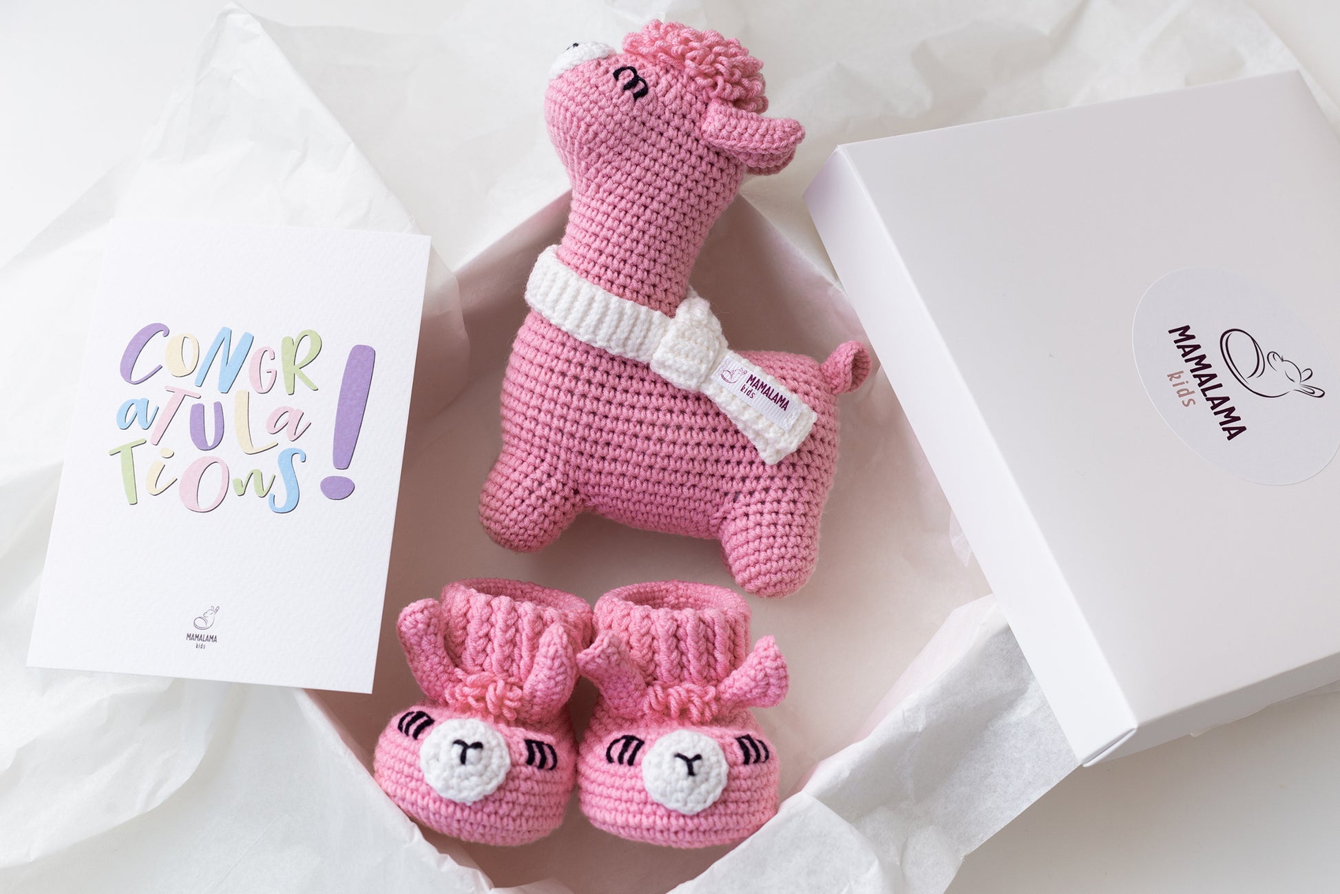 This is a gift box set which consists of a toy, booties, tissue paper, and a cute white box.