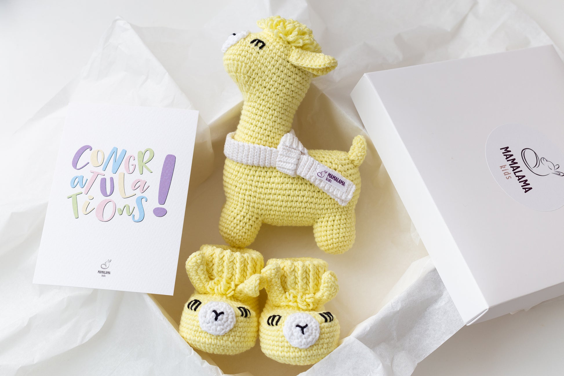 This is a gift box set which consists of a toy, booties, tissue paper, and a cute white box.